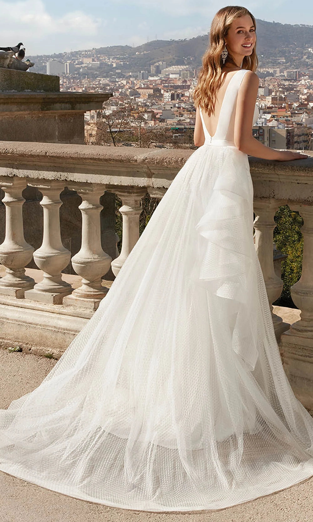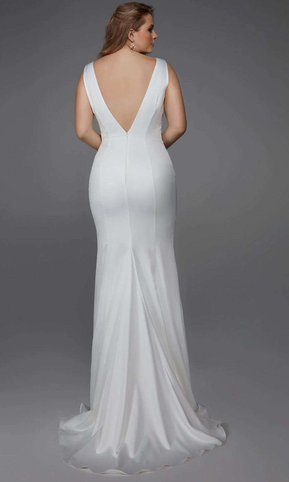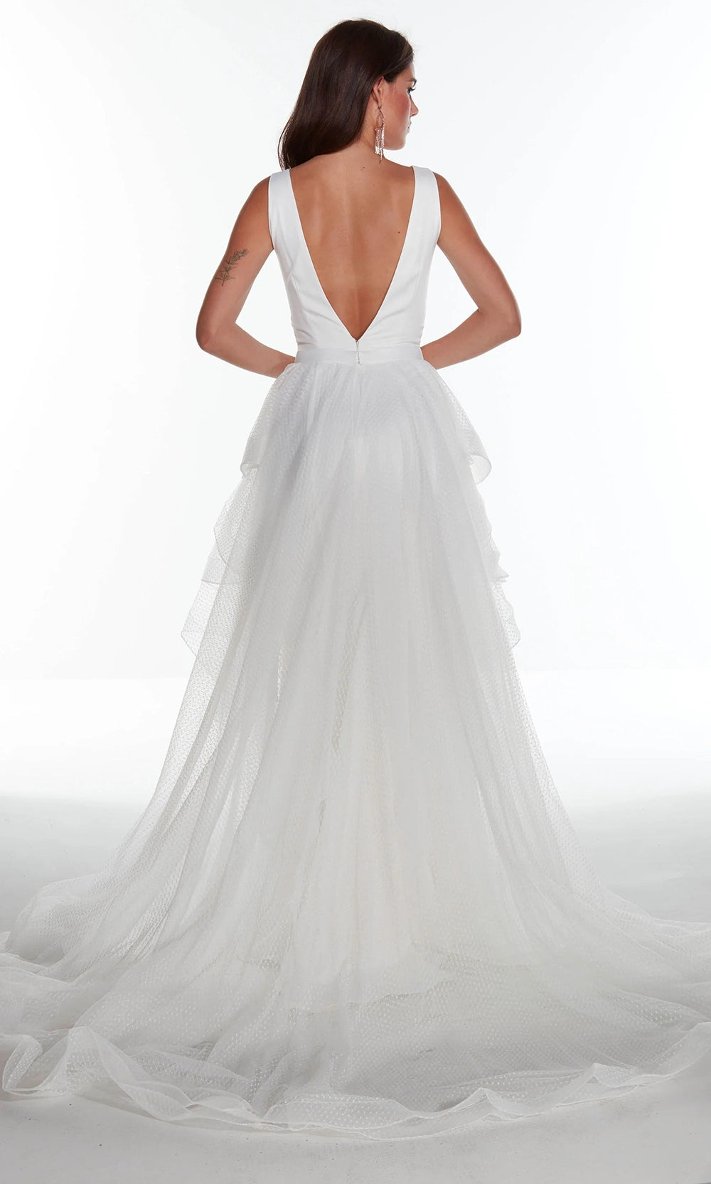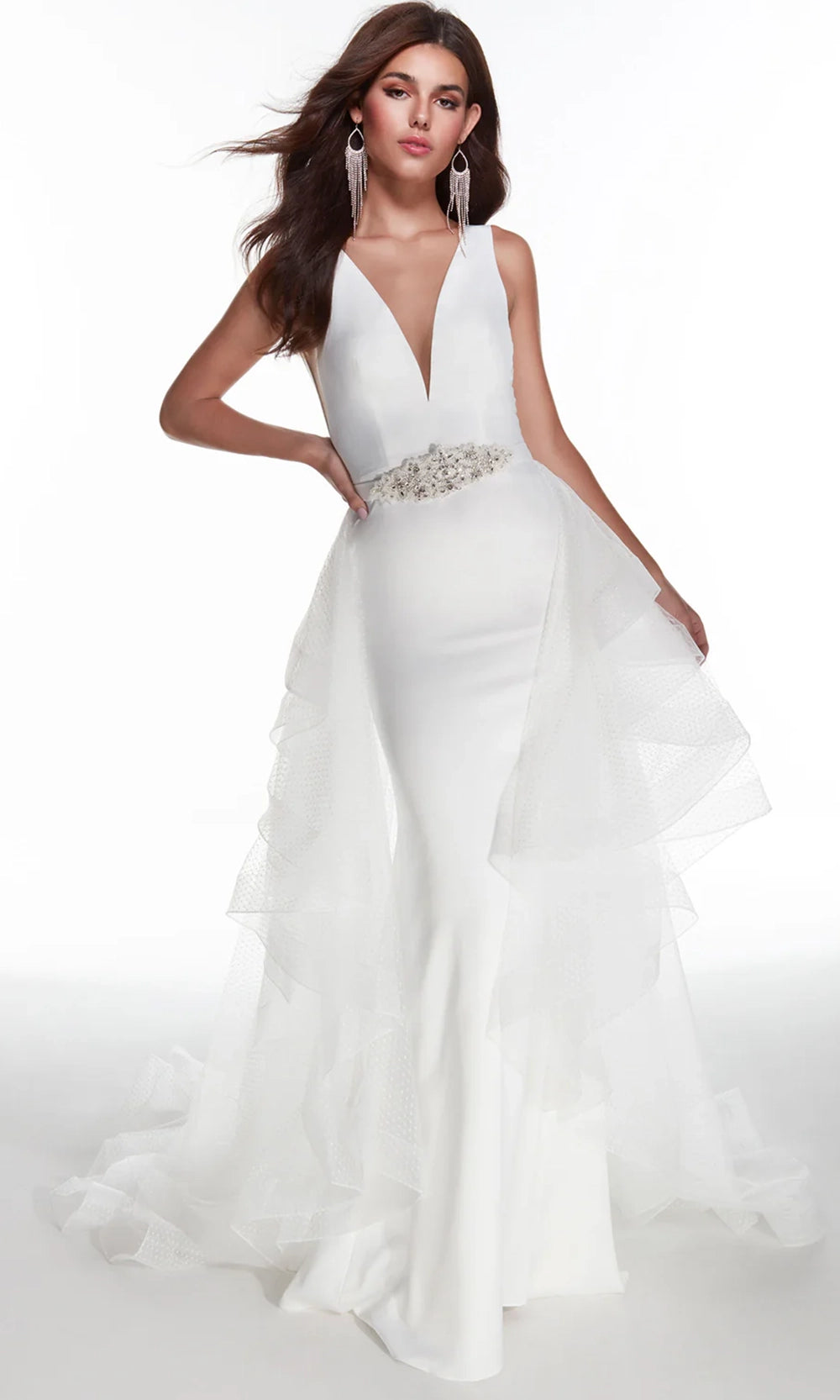 The Alyce Paris 7019 gown is a masterpiece in refined sophistication, featuring soft satin and subtle dot net to create a luxurious yet understated look. Its sleeveless plunging V-neckline is balanced by a flattering natural waist and smooth sheath silhouette, culminating in a graceful train that follows with timeless elegance. The V-back echoes the neckline, offering a harmonious and streamlined effect. A removable overskirt cascades in soft ruffles, cinched at the waist with a beautifully beaded band for added elegance. Meticulously designed for spring or destination ceremonies, this Alyce Paris 7019 gown radiates refined style with every swirl. Model is wearing Diamond White color.
