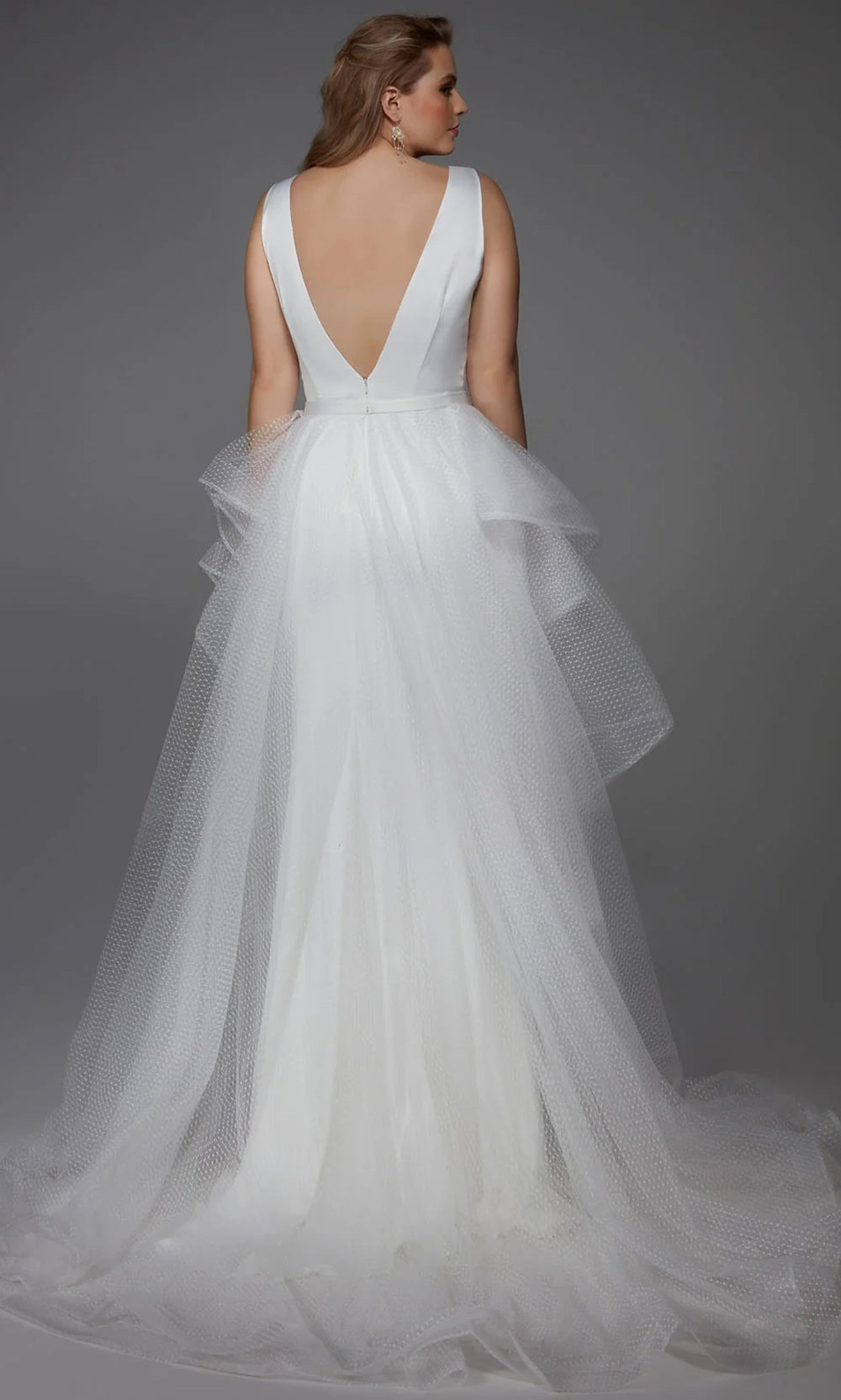 | Details: | Sleeveless, Low V-Open Back, Sweep Train, Detachable Ruffle Overskirt With Beaded Waistband |