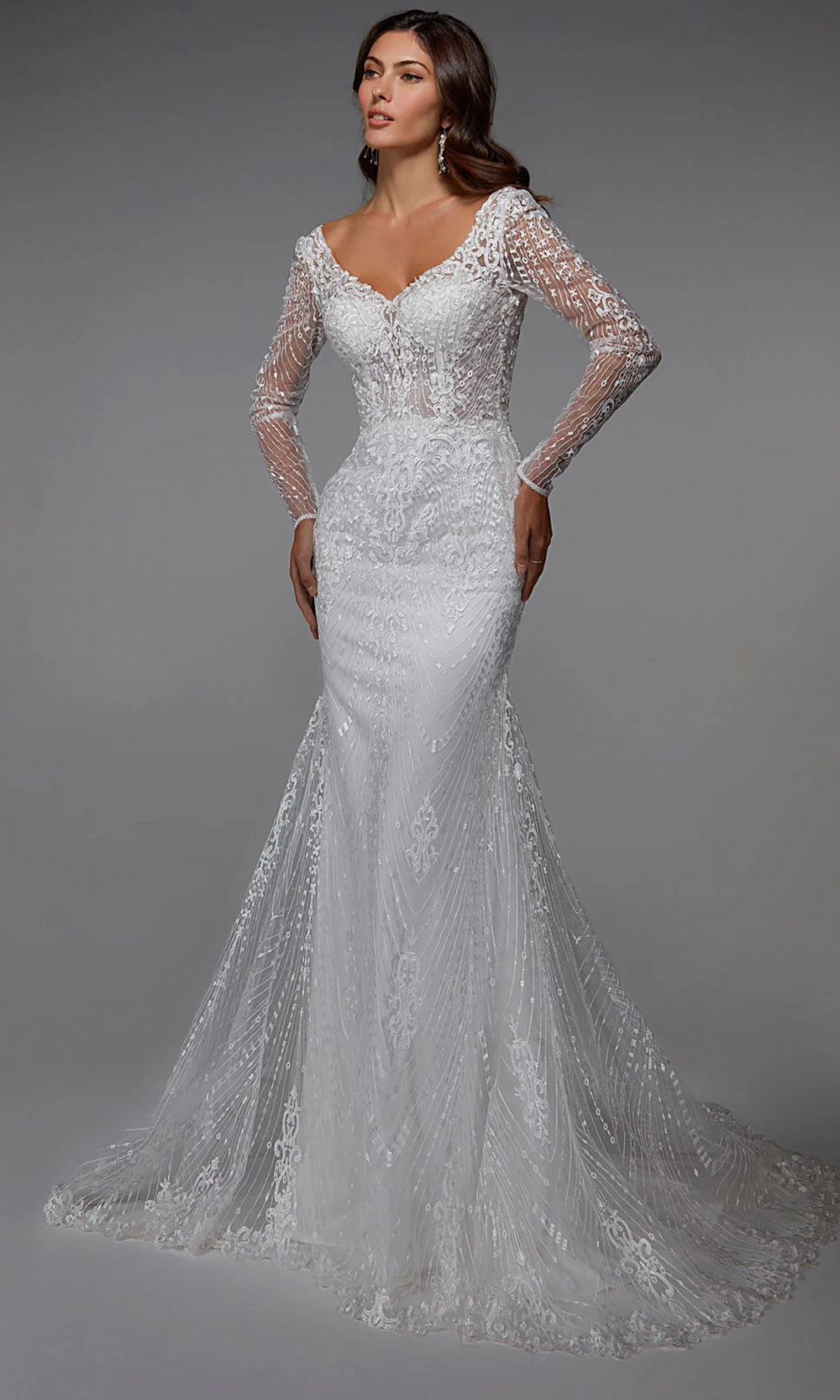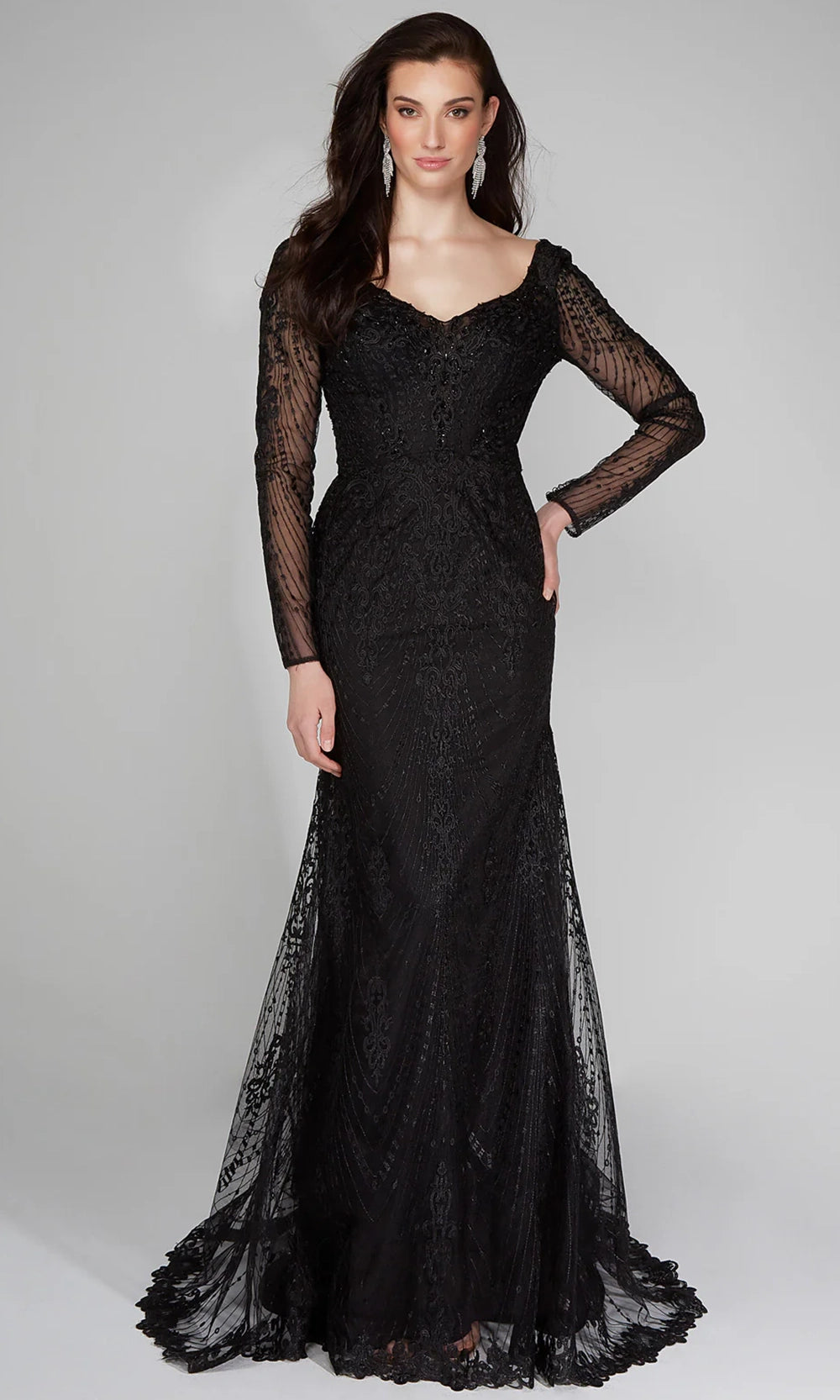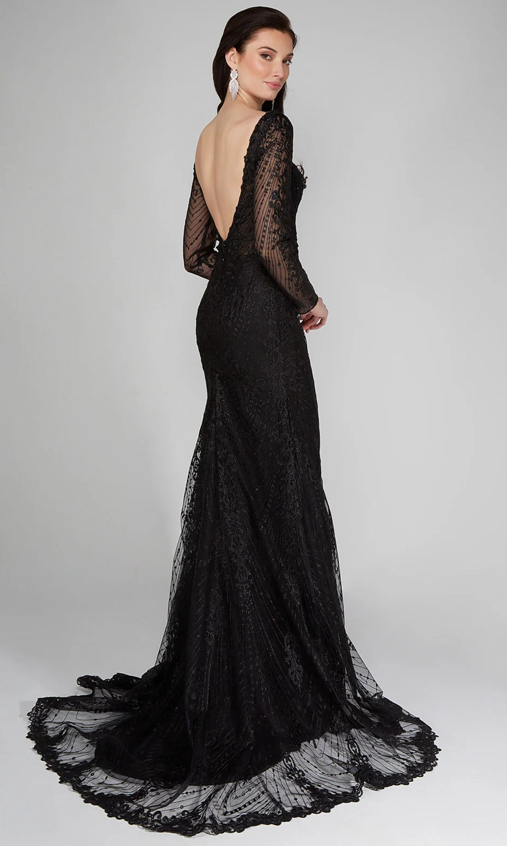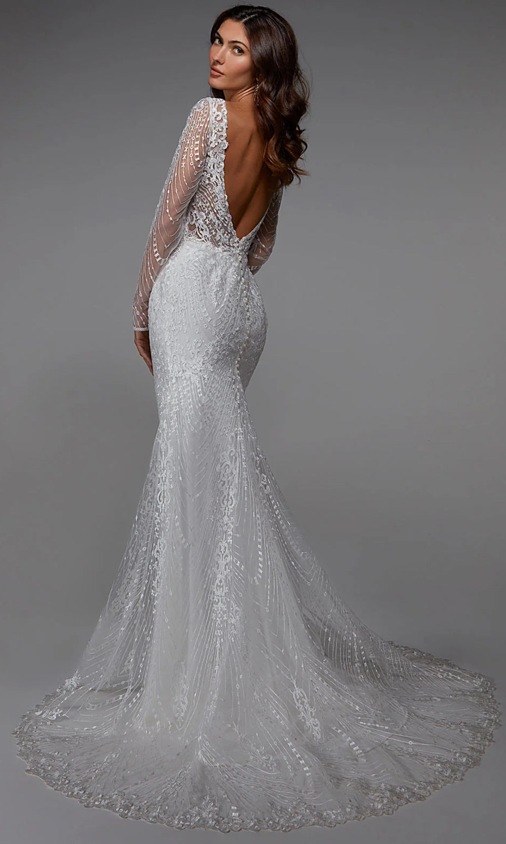 Radiate grace and beauty on your most cherished day in this Alyce Paris 7030 dress. The v-neckline is complemented by long sheer sleeves that are entirely adorned in lace embroidery. With a fitted sheath silhouette that flares into a sweep train and scalloped hem, this style adds dramatic flair and classic appeal to any special occasion. Finished with a sexy plunging v-open back and subtle textural patterning. Alyce Paris 7030 allows for graceful movement and delivers standout elegance from every angle, making it a perfect fit for high-style moments. Models are wearing Black, and Ivory colors.