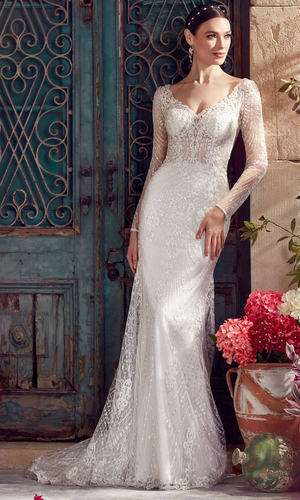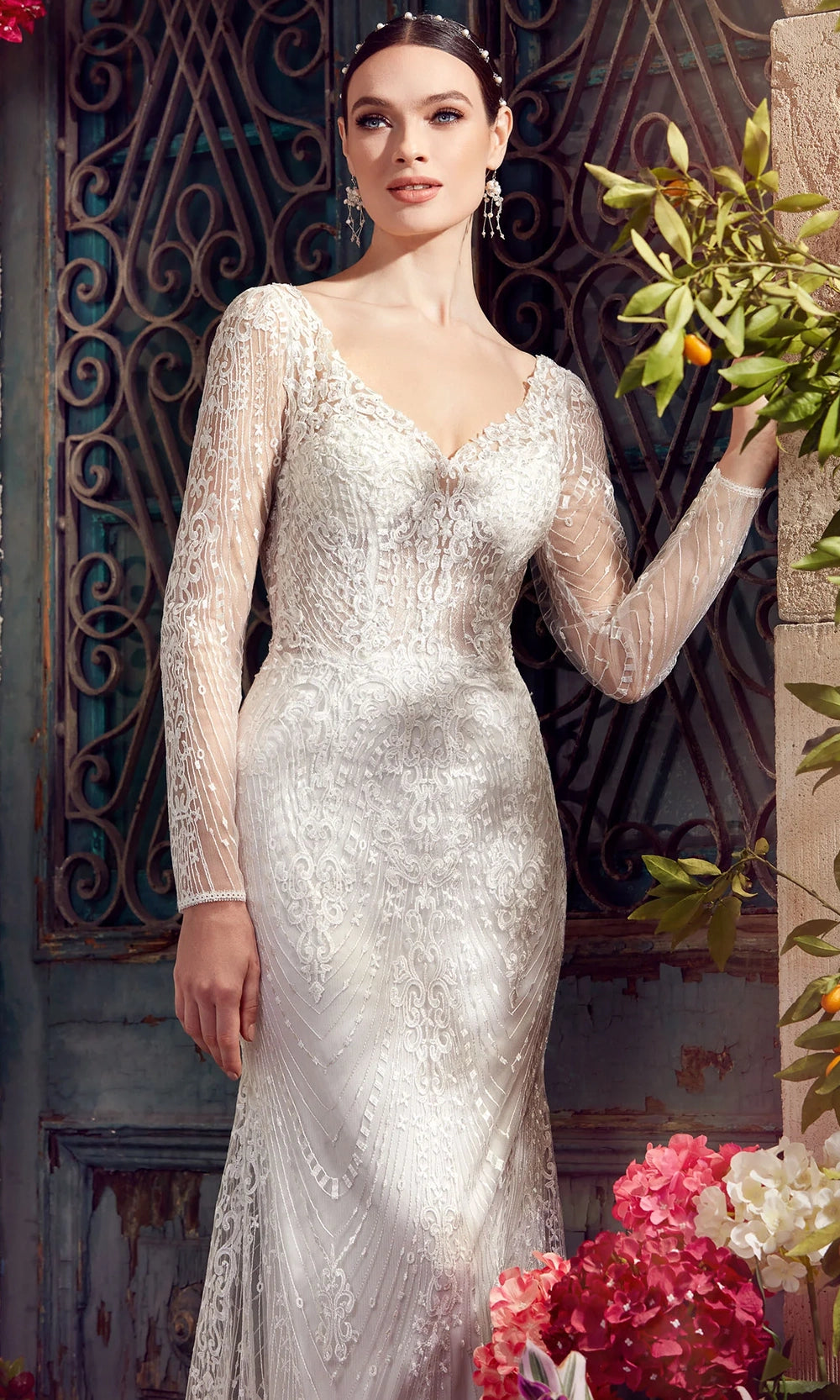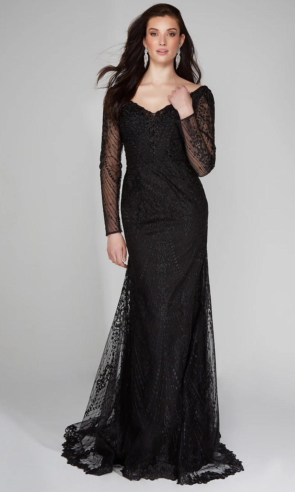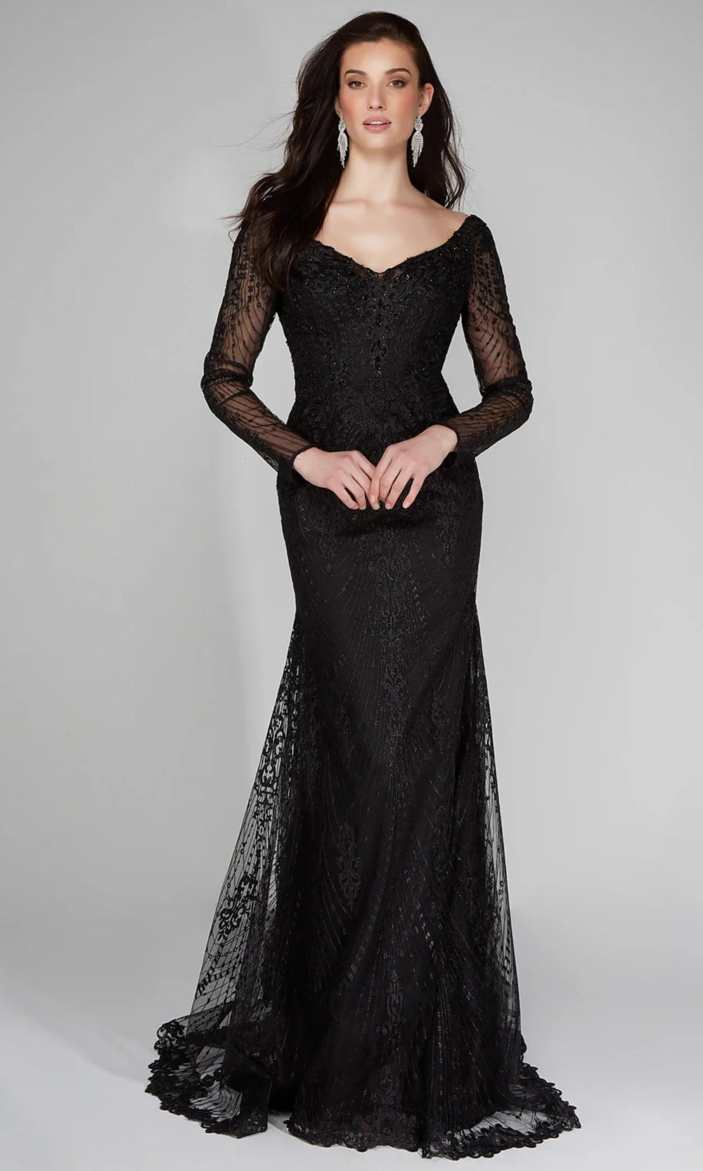 Radiate grace and beauty on your most cherished day in this Alyce Paris 7030 dress. The v-neckline is complemented by long sheer sleeves that are entirely adorned in lace embroidery. With a fitted sheath silhouette that flares into a sweep train and scalloped hem, this style adds dramatic flair and classic appeal to any special occasion. Finished with a sexy plunging v-open back and subtle textural patterning. Alyce Paris 7030 allows for graceful movement and delivers standout elegance from every angle, making it a perfect fit for high-style moments. Models are wearing Black, and Ivory colors.