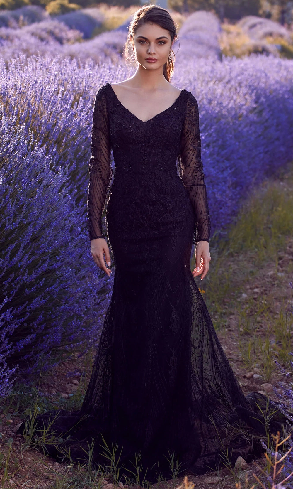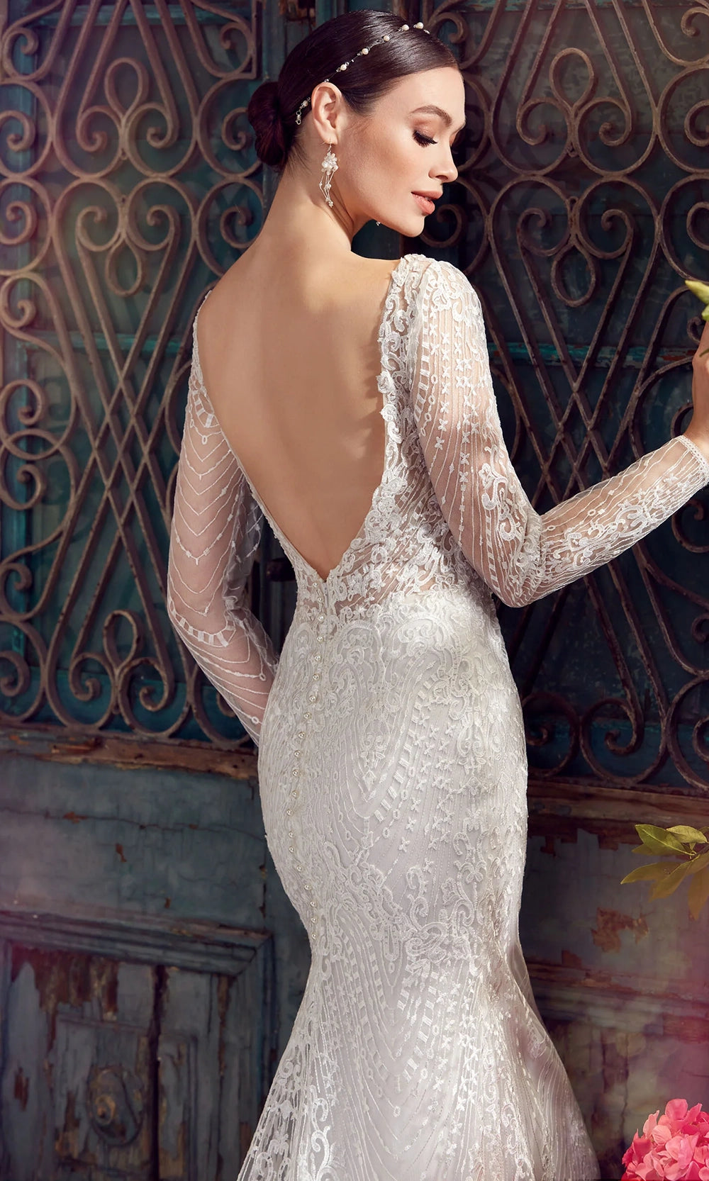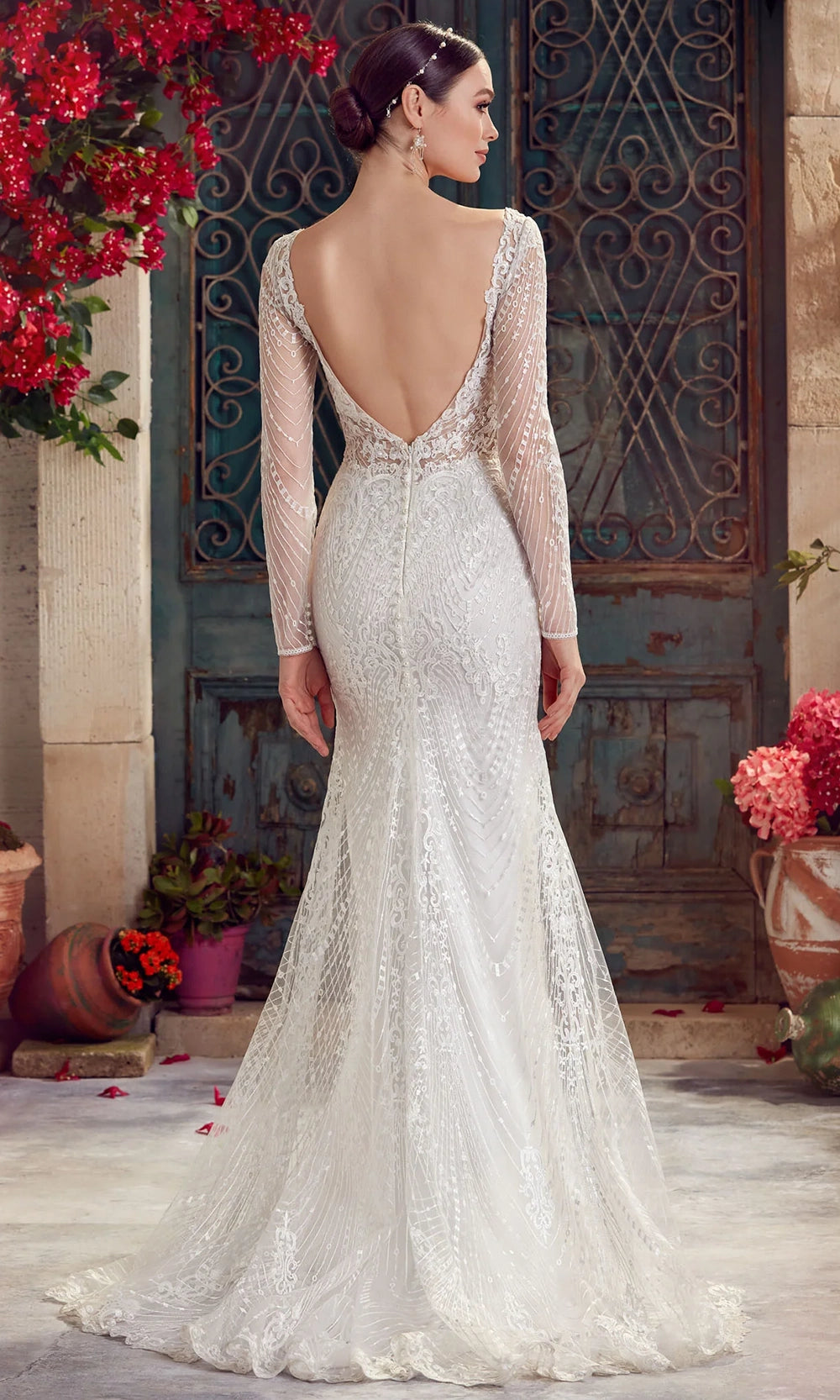 | Details: | Long Sheer Sleeves, Embroidery, Beaded Accent, Scalloped Hem, Sweep Train, Open V-Back |