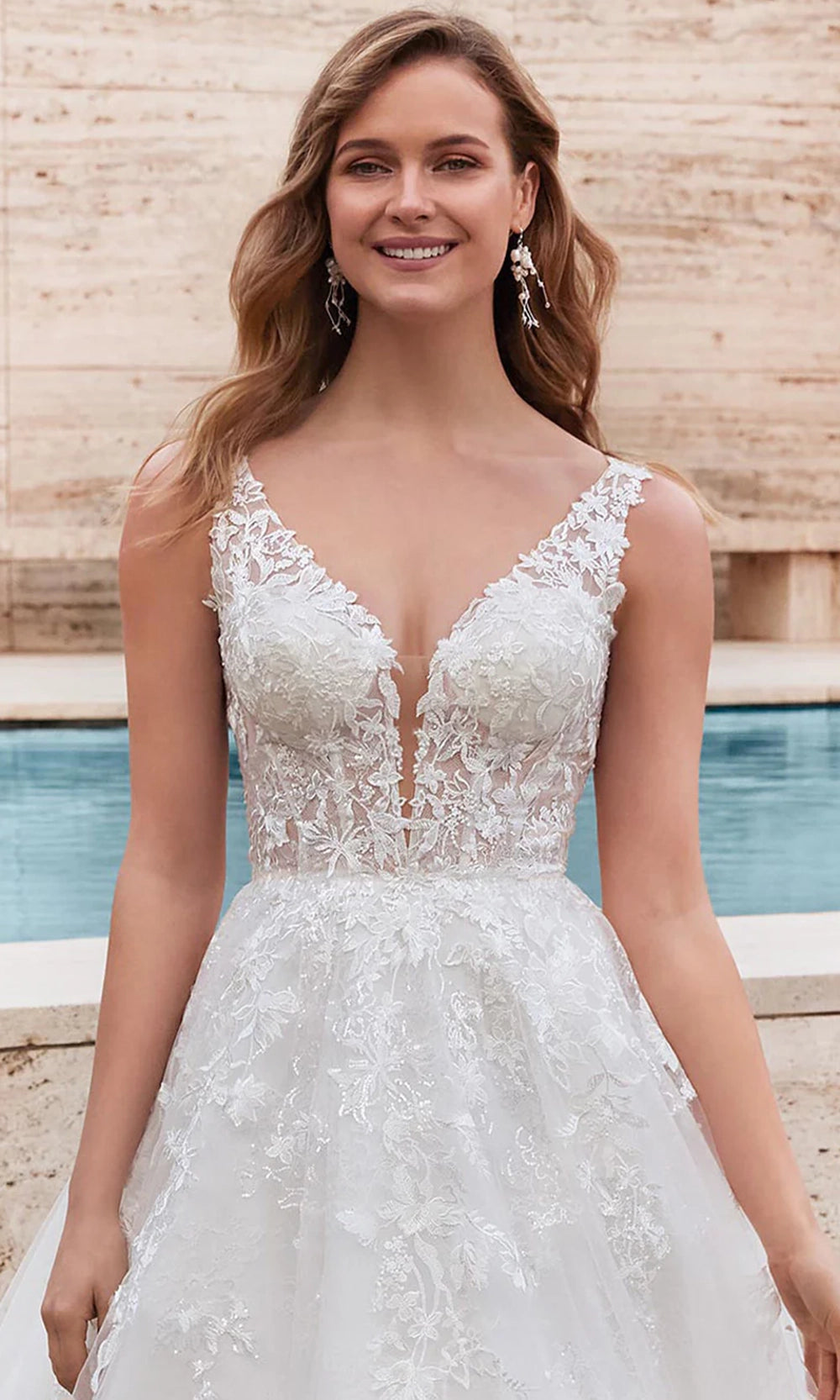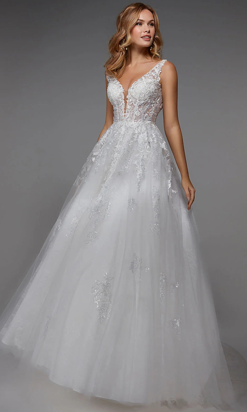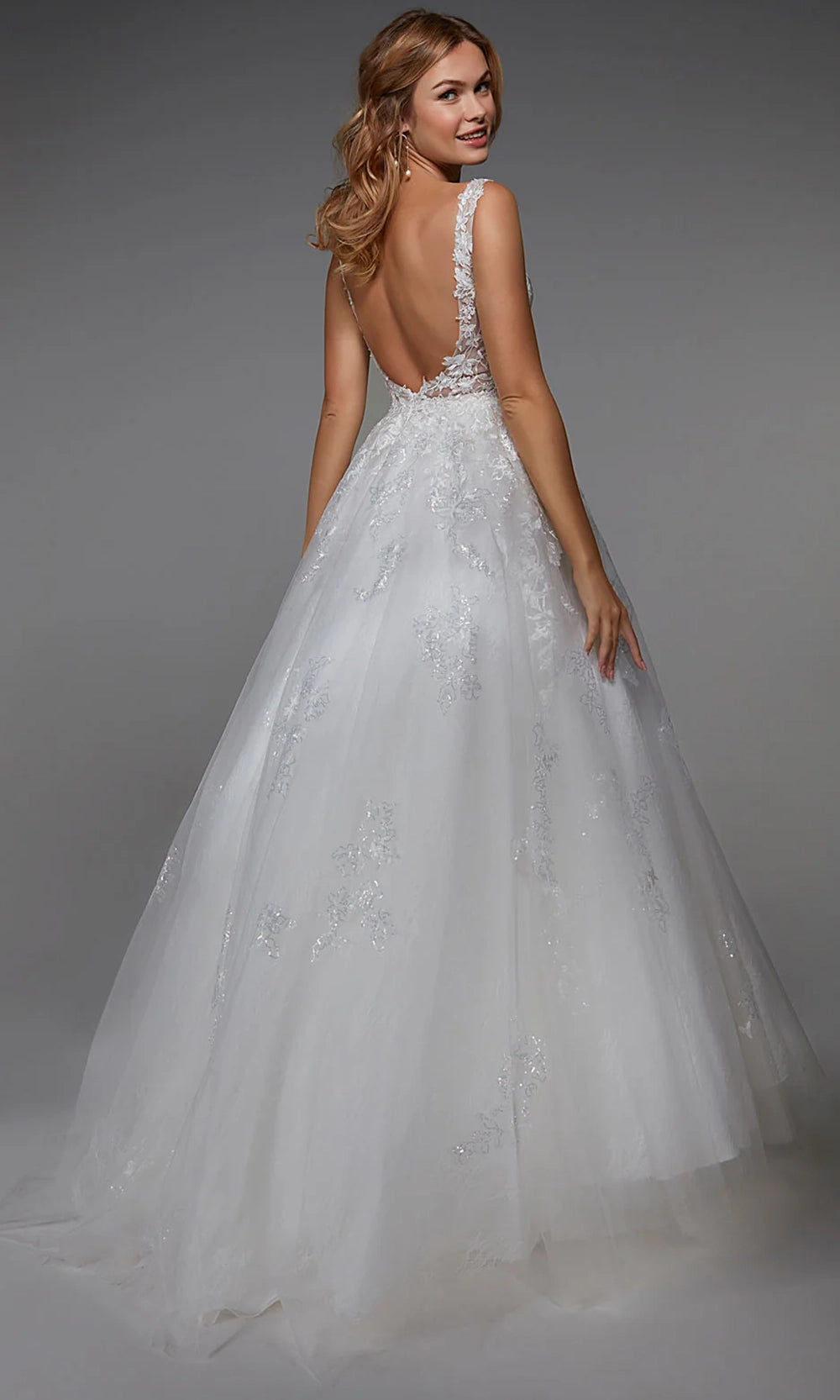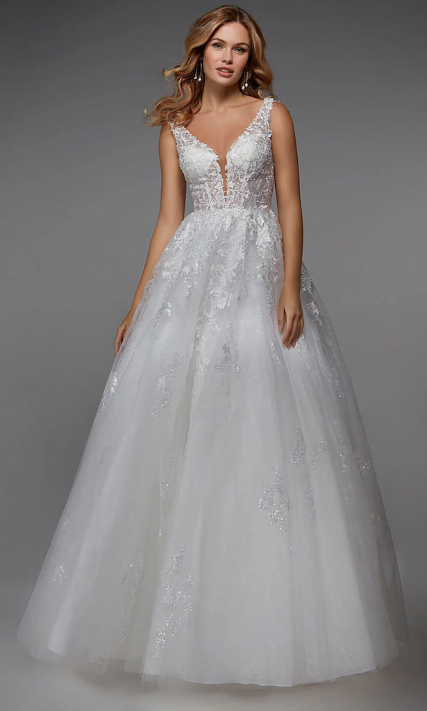 Romantic textures and timeless volume define this ballgown silhouette crafted with the signature detail of Alyce Paris 7039. A plunging V-neckline leads into a floral lace bodice that shapes the upper frame with elegance and grace. The natural waistline anchors the design, opening into a voluminous layered tulle skirt for full movement. Embroidery and sequin embellishments scattered across the bodice elevate the gown charm. Perfect for brides who want a refined look with whimsical touches, Alyce Paris 7039 delivers a breathtaking silhouette from every angle. Model is wearing Ivory color.