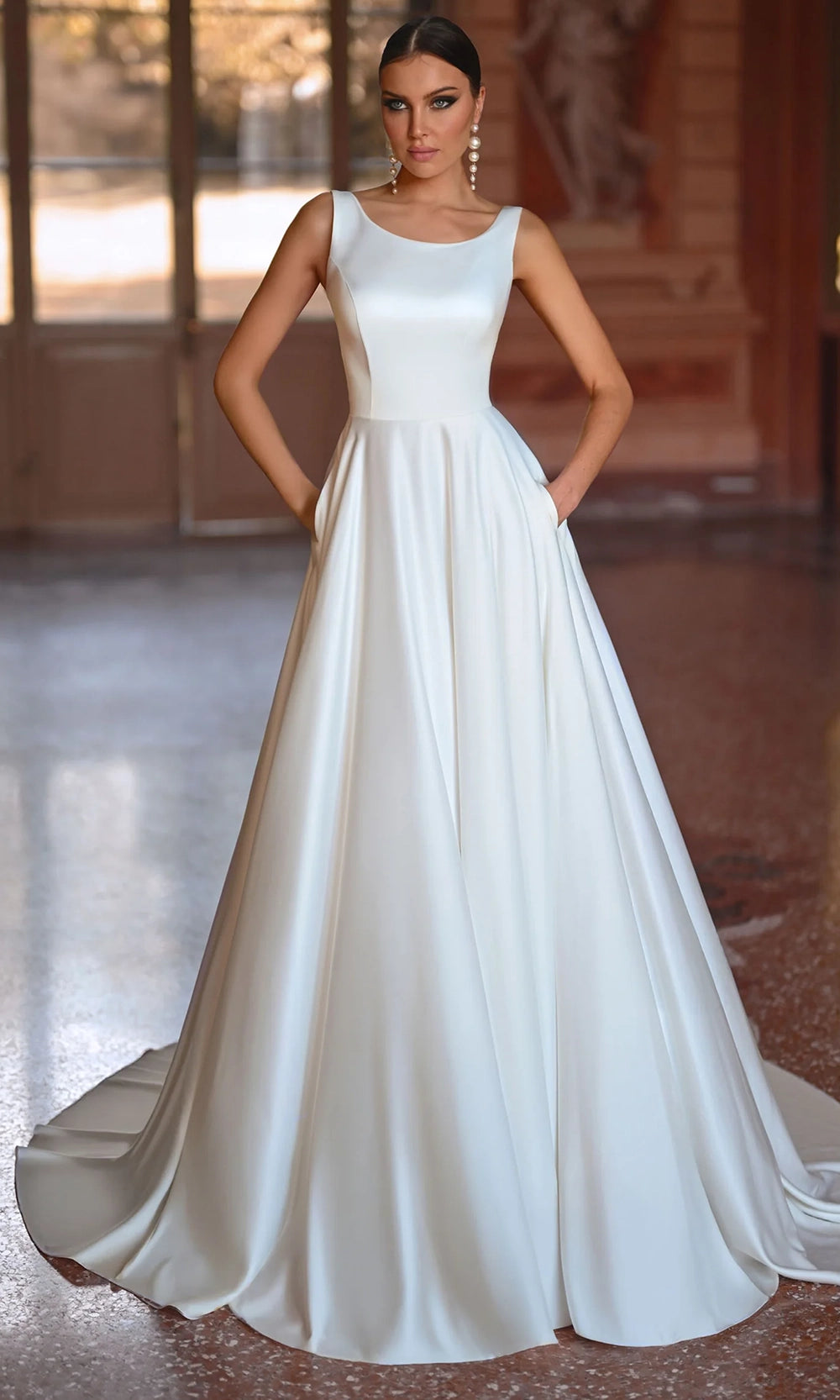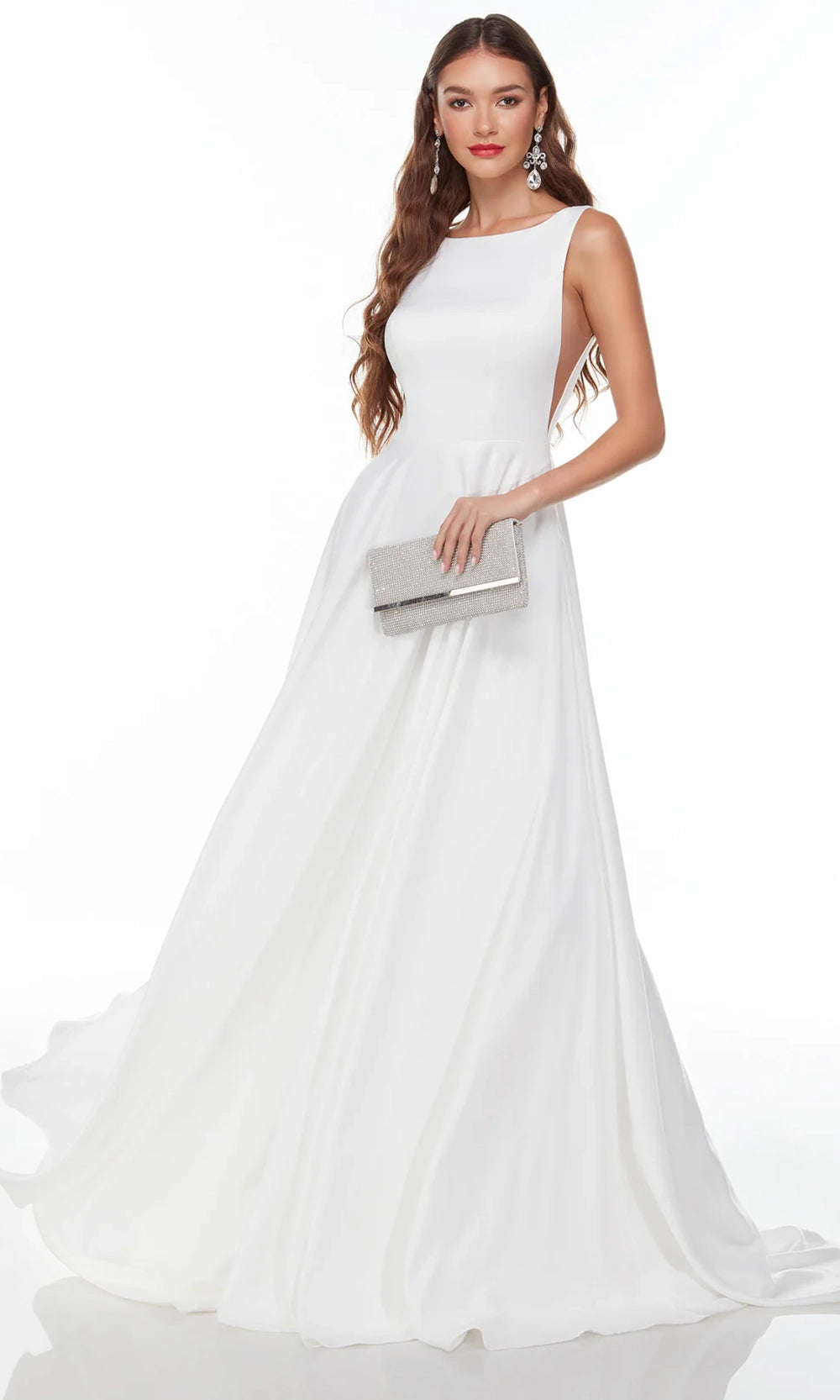 Timeless elegance meets contemporary luxury in Alyce Paris 7053, a breathtaking satin gown that captures the essence of sophisticated bridal styling. The sleeveless bateau neckline frames the collarbone with subtle grace, while the structured bodice provides a flawless fit. A natural waistline gives way to the A-line silhouette that flows seamlessly into a sweep train, making every step feel regal. Thoughtfully designed with hidden side pockets for comfort and convenience, this gown is both functional and stunning. Make your moment unforgettable in the classic silhouette of Alyce Paris 7053. Model is wearing Diamond White color.