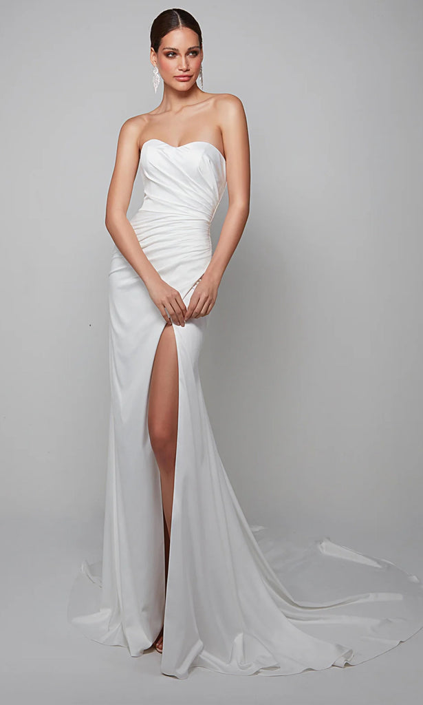 Graceful simplicity defines the essence of Alyce Paris 7057, a strapless gown that merges classic elegance with alluring detail. The sweetheart neckline contours beautifully, while the ruched bodice flatters and sculpts. A high slit brings a daring edge to the sleek sheath silhouette, creating a look that is both timeless and bold. Finished with a sweeping train that enhances its fluid lines, this sheath gown is made for the bride who moves with confidence and poise. Let Alyce Paris 7057 bring refined allure to your celebration. Model is wearing Diamond White color.