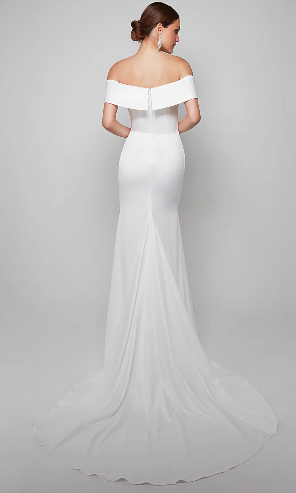 Soft draping and sultry lines highlight the romantic charm of Alyce Paris 7059. The folded off-shoulder neckline wraps gently across the bodice, creating a flattering and graceful silhouette. Ruching along the bodice adds texture and form-fitting appeal, emphasizing the natural waistline and enhancing curves. The perfect satin material allows for ease of movement while the soft court train brings classic finish. Alyce Paris 7059 sheath gown offers timeless simplicity that flatters every angle with ease. Model is wearing Diamond White color.
