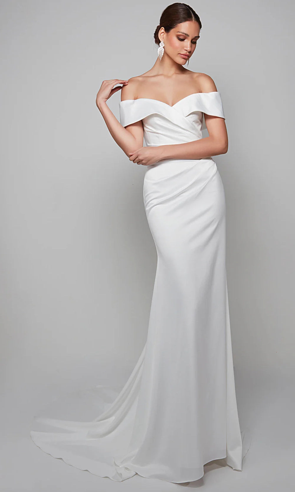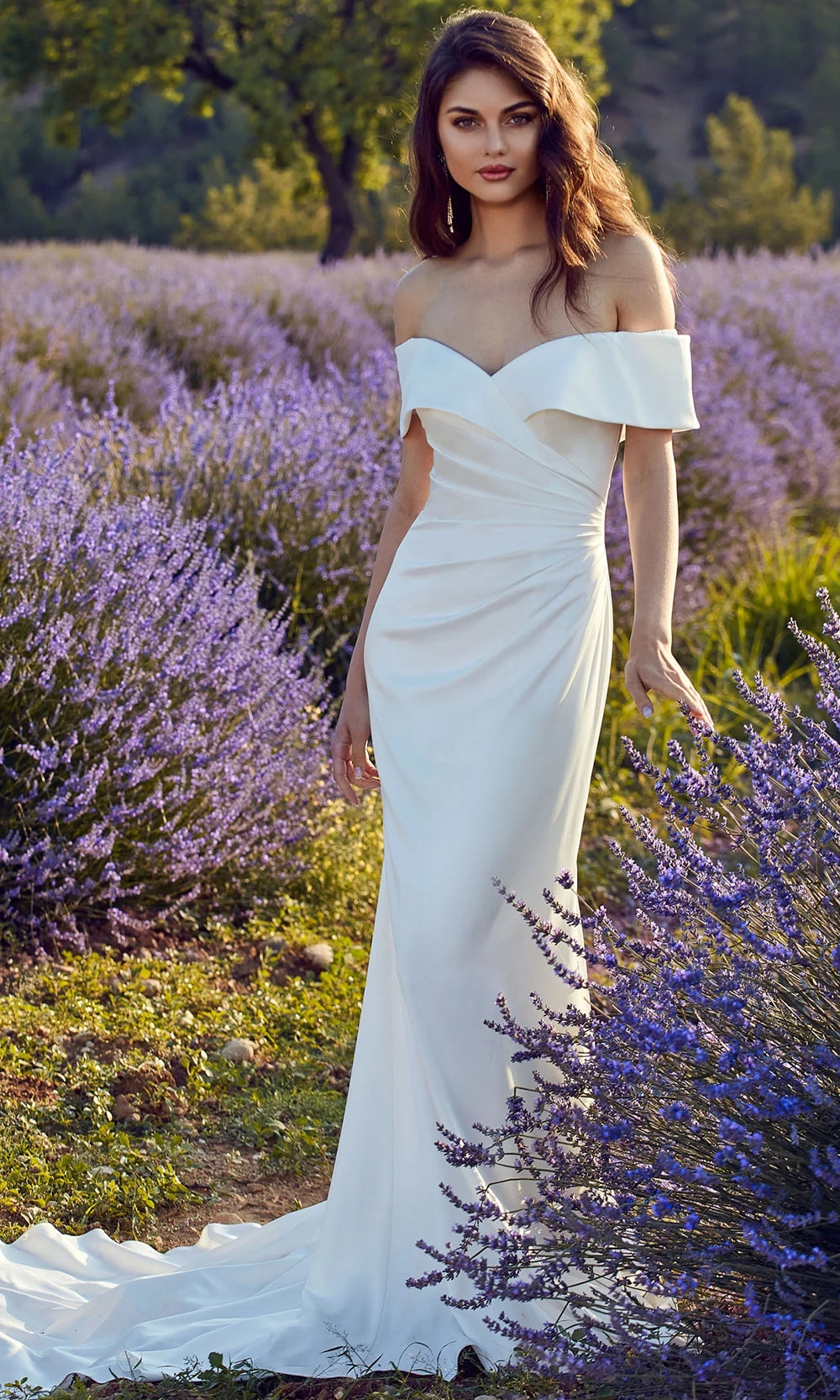 | Details: | Ruched Bodice, Short Sleeves, Folded Detail, Mid-Open Back, Court Train |