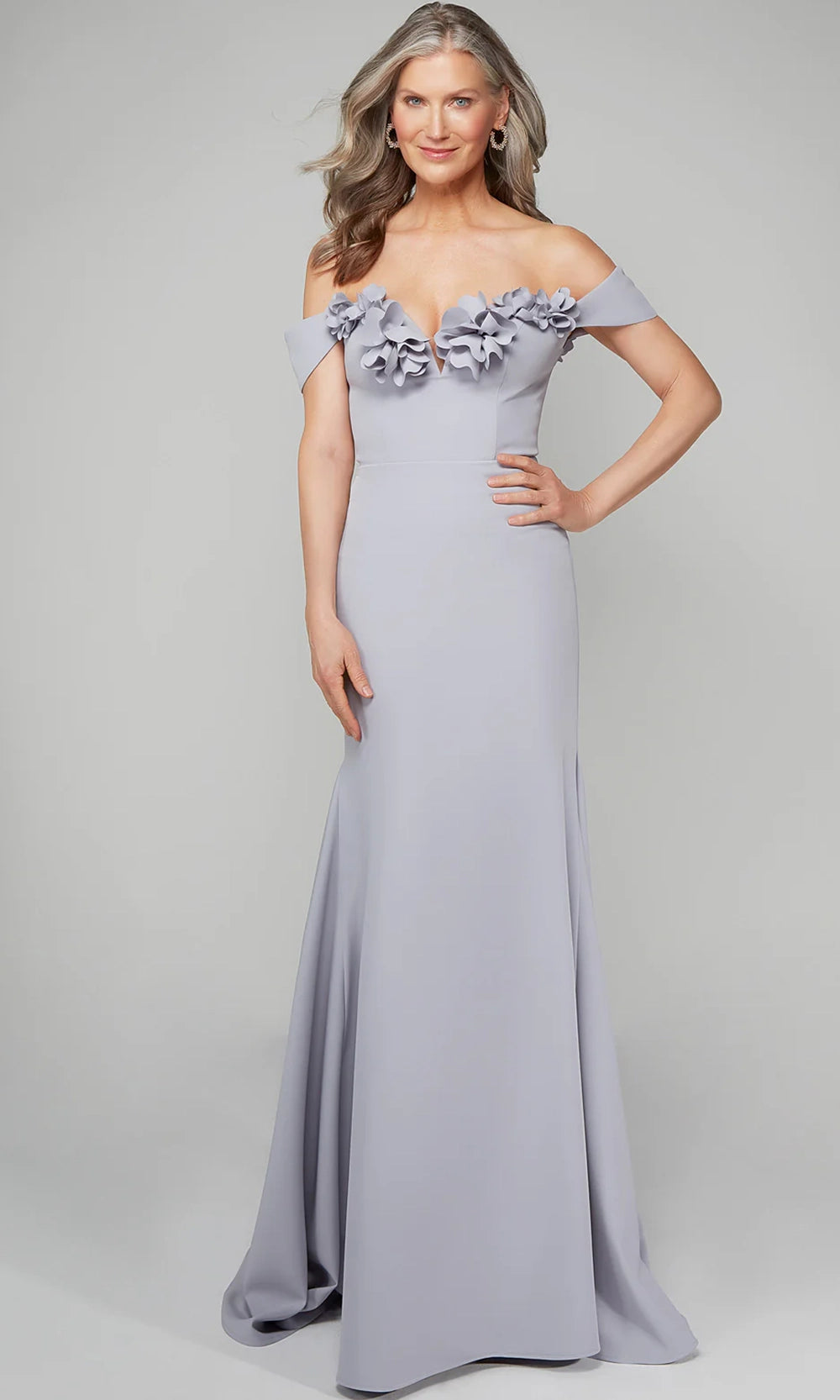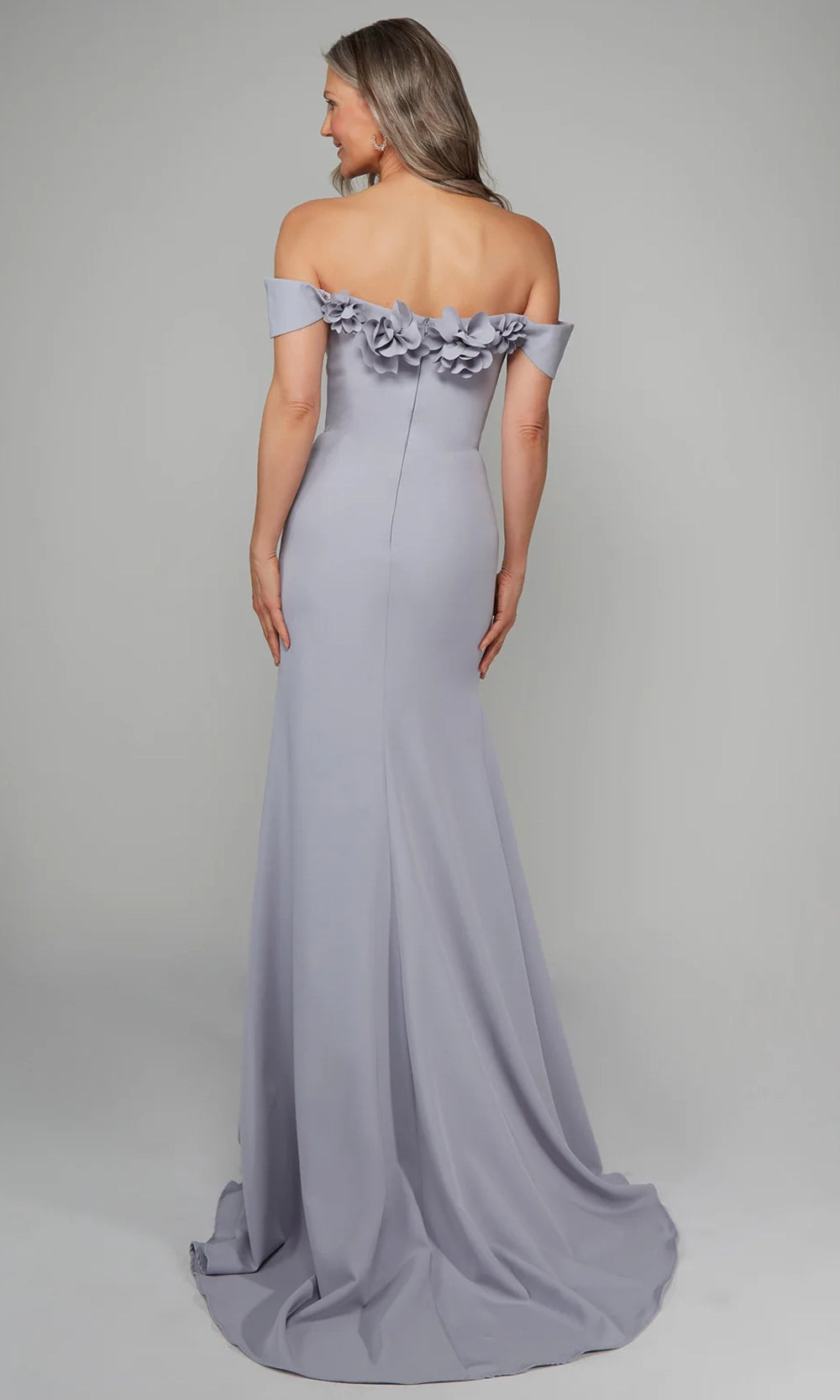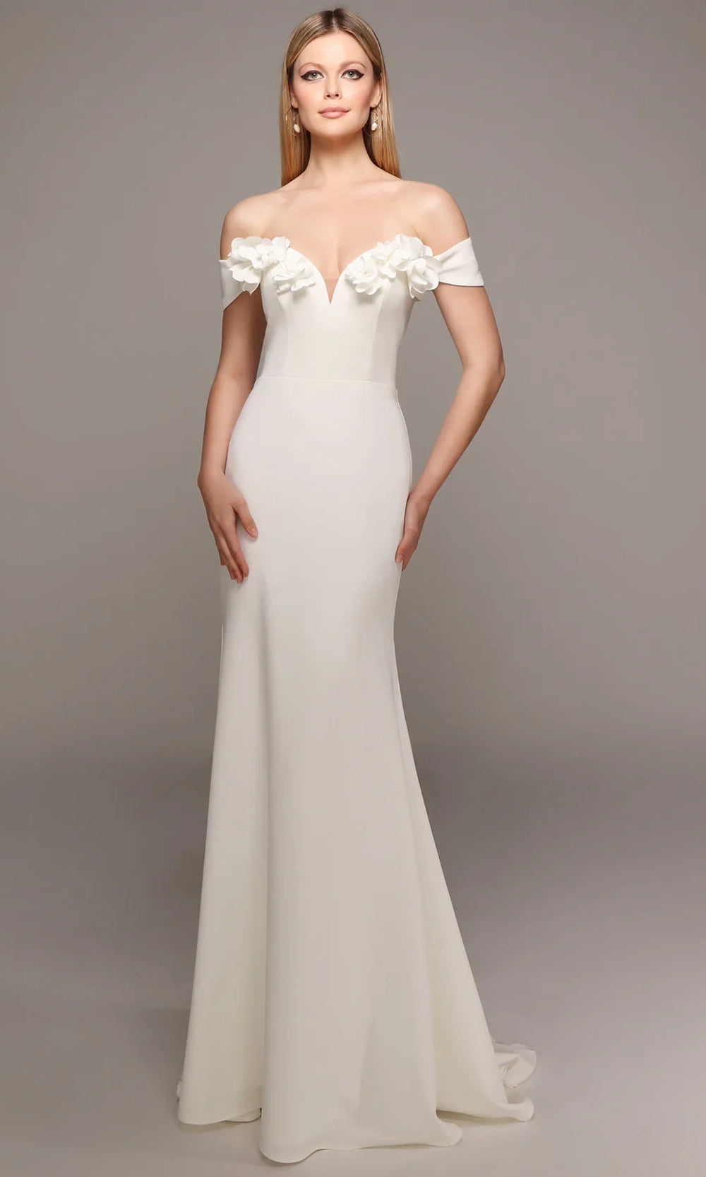 Sleek with a touch of artistry, Alyce Paris 7062 brings floral elegance to a streamlined silhouette. The off-shoulder cap sleeves and sweetheart neckline are accentuated with sculpted 3D floral detailing, adding dimension and softness to the bodice. Crafted in italian knit, the fabric molds to the figure and falls into a floor-length trumpet silhouette for classic polish. Ideal for formal settings that call for quiet sophistication, this gown blends structured tailoring with delicate design. Choose Alyce Paris 7062 for a look that is graceful, feminine, and elegantly composed. Models are wearing Diamond White, Icelandic Blue, Ivory, and Midnight colors.