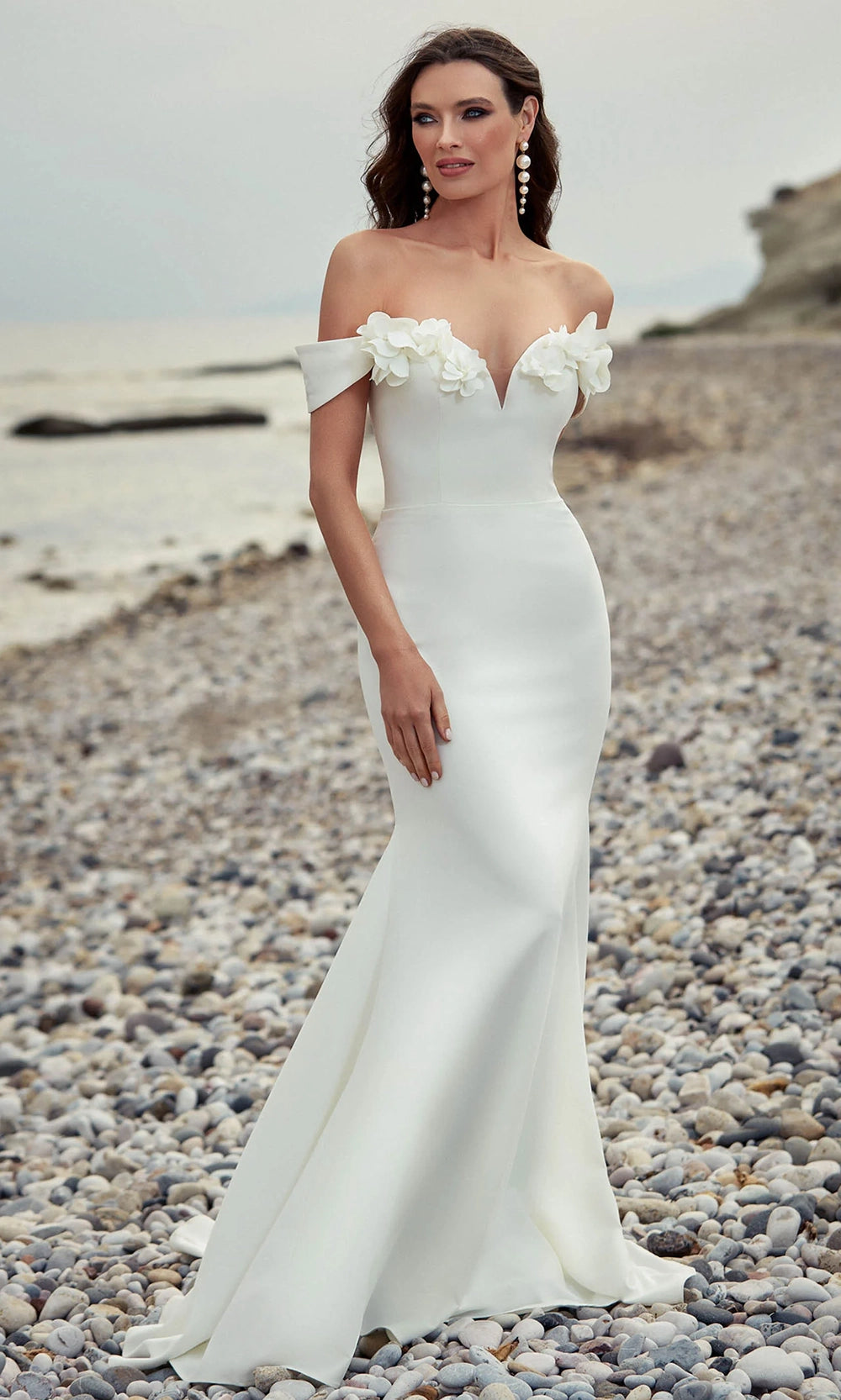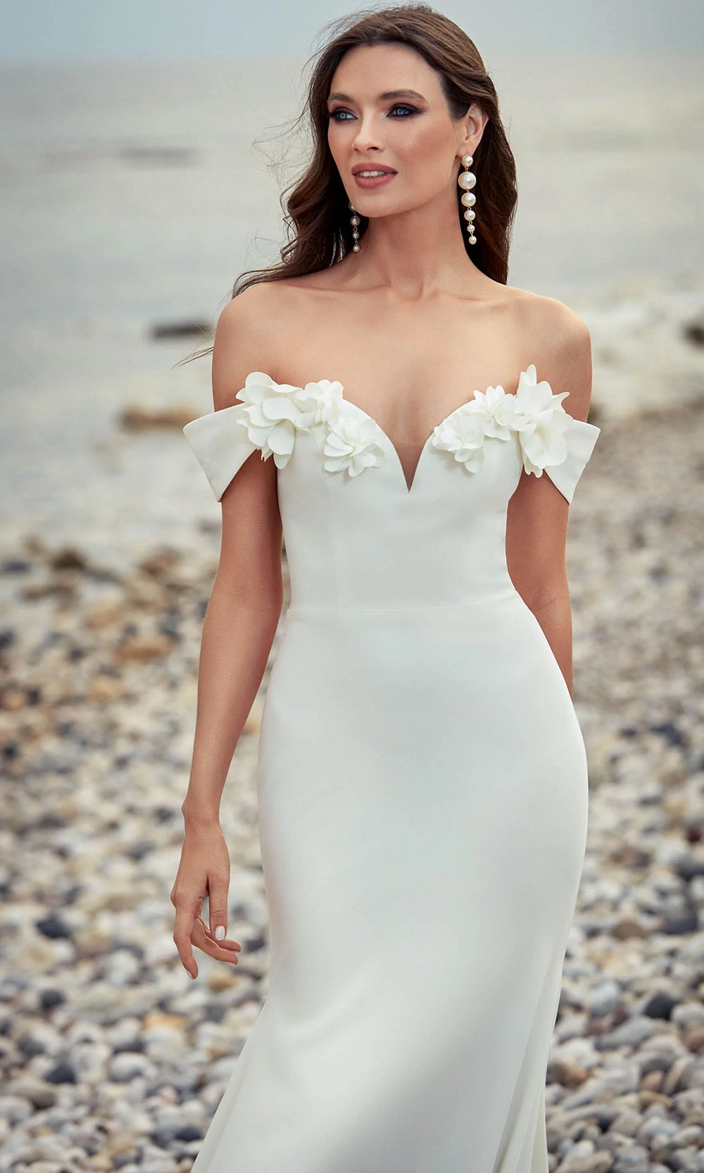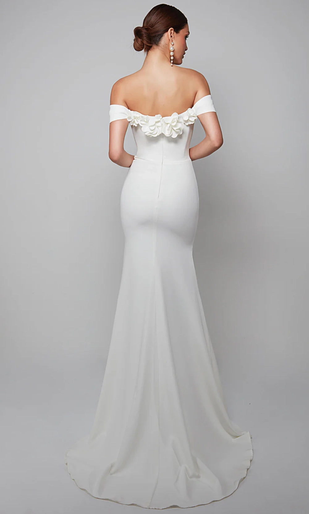 Sleek with a touch of artistry, Alyce Paris 7062 brings floral elegance to a streamlined silhouette. The off-shoulder cap sleeves and sweetheart neckline are accentuated with sculpted 3D floral detailing, adding dimension and softness to the bodice. Crafted in italian knit, the fabric molds to the figure and falls into a floor-length trumpet silhouette for classic polish. Ideal for formal settings that call for quiet sophistication, this gown blends structured tailoring with delicate design. Choose Alyce Paris 7062 for a look that is graceful, feminine, and elegantly composed. Models are wearing Diamond White, Icelandic Blue, Ivory, and Midnight colors.