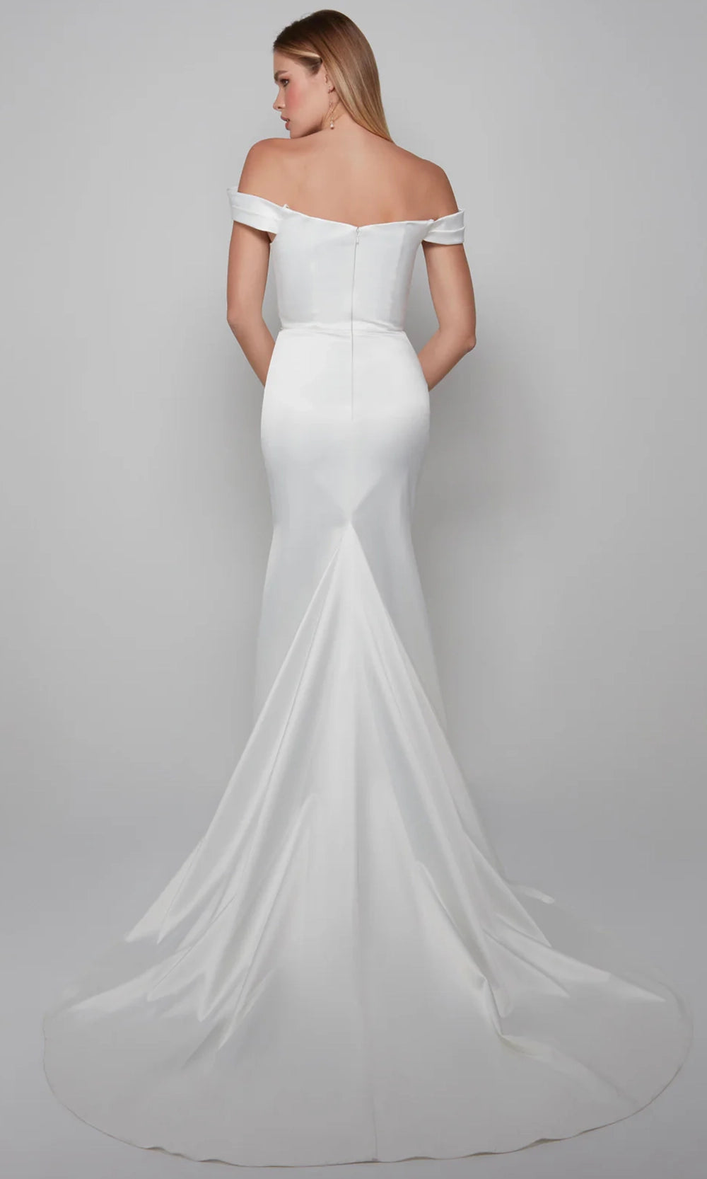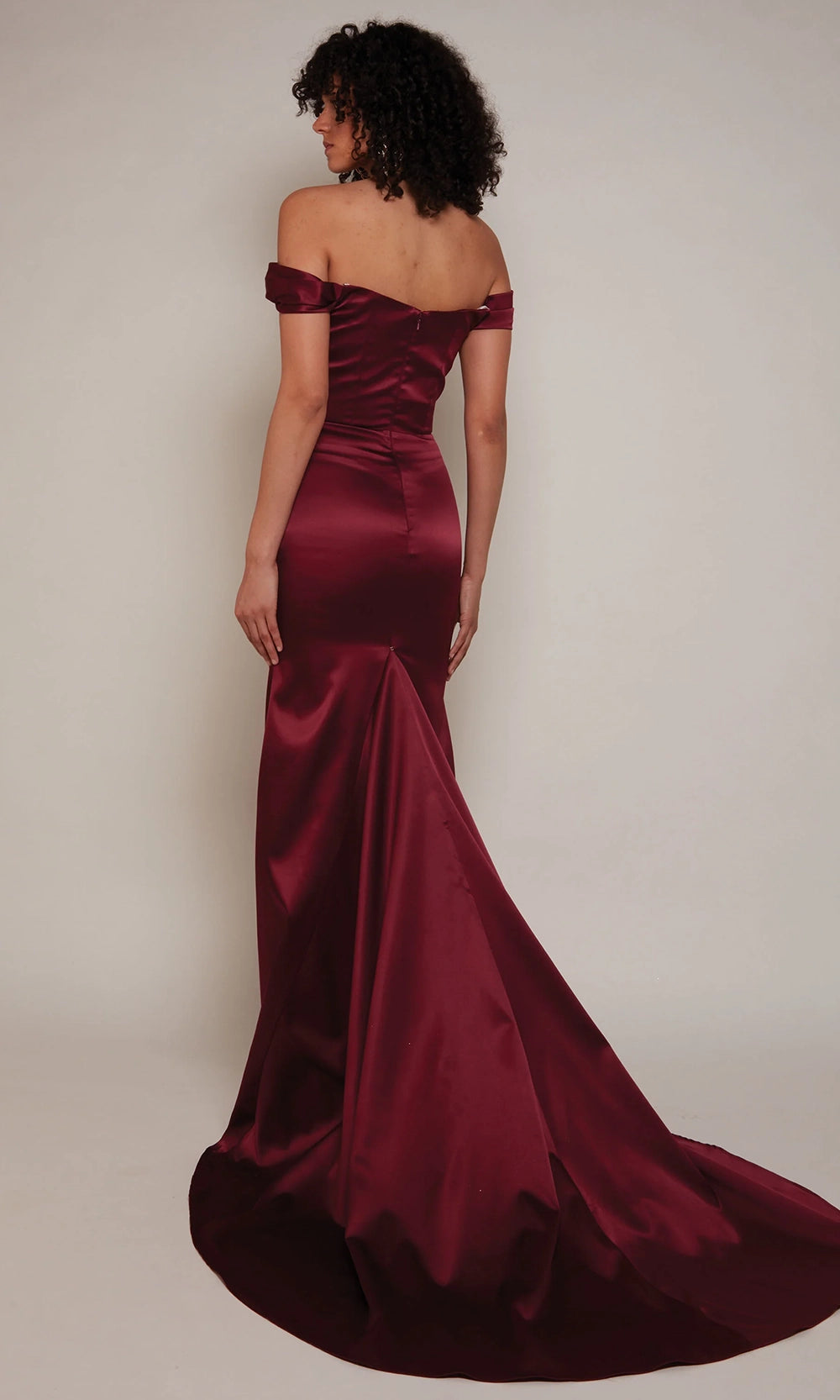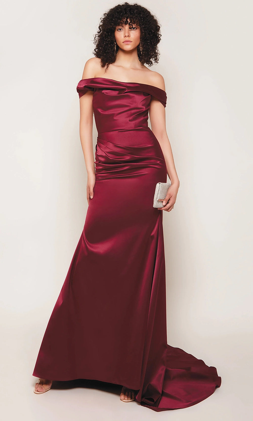 Embrace graceful sophistication in the Alyce Paris 7064 gown that reflects both style and poise. Off-shoulder neckline and cap sleeves add a romantic touch, while the ruched detail flatters the shape and accentuates the natural waistline. The duchess satin fabric lends a soft sheen that enhances the gown timeless appeal. A fluid sheath skirt extends to a sweep train, giving the overall design a polished finish. Alyce Paris 7064 is a refined ensemble that merges structured style with modern romance in the most captivating way. Models are wearing Ivory, and Burgundy colors.