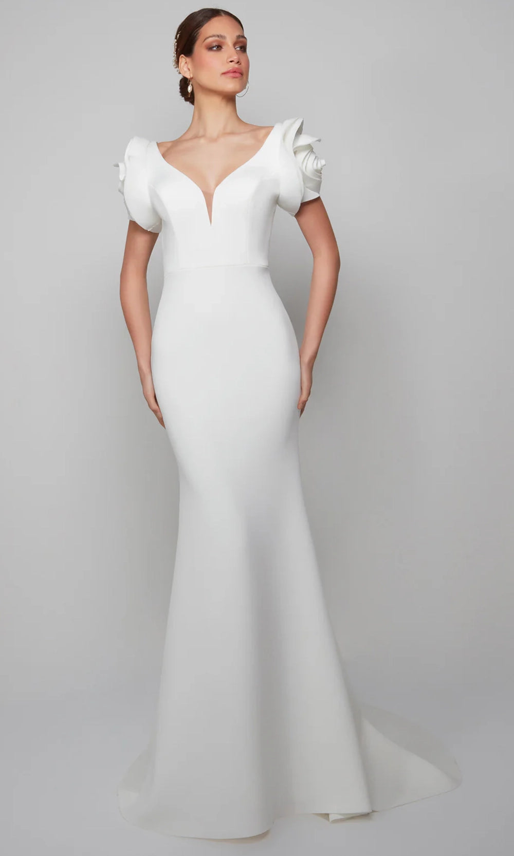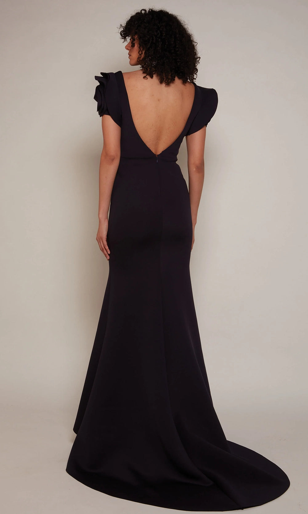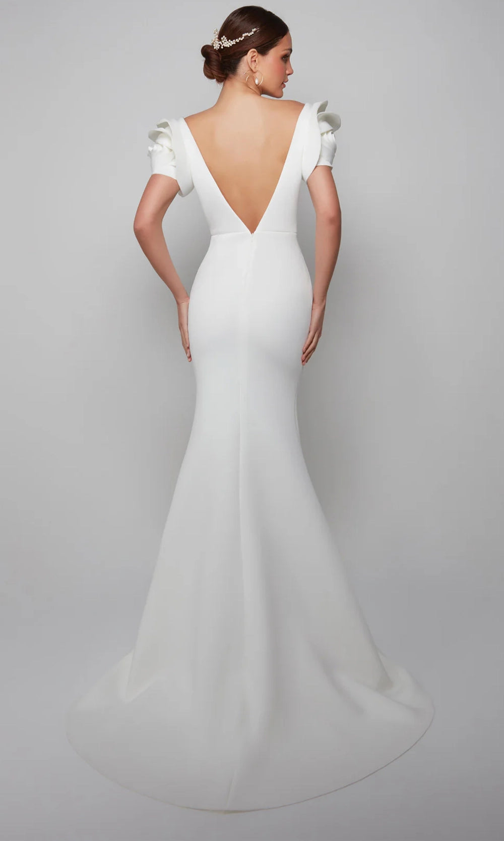 Alyce Paris 7066 style is a statement piece designed to command attention with refined sophistication. The plunging V-neckline is daring yet elegant, setting the tone for a dramatic silhouette that hugs the body. Elaborate sculpted rose short sleeves add a high-fashion twist, elevating this mermaid gown into a true work of art. The tailored design finishes in a flowing sweep train, creating graceful movement and a striking presence. For a formal occasion where bold elegance is essential, Alyce Paris 7066 gown is an unforgettable choice that combines structure and beauty. Models are wearing Ivory, and Midnight colors.