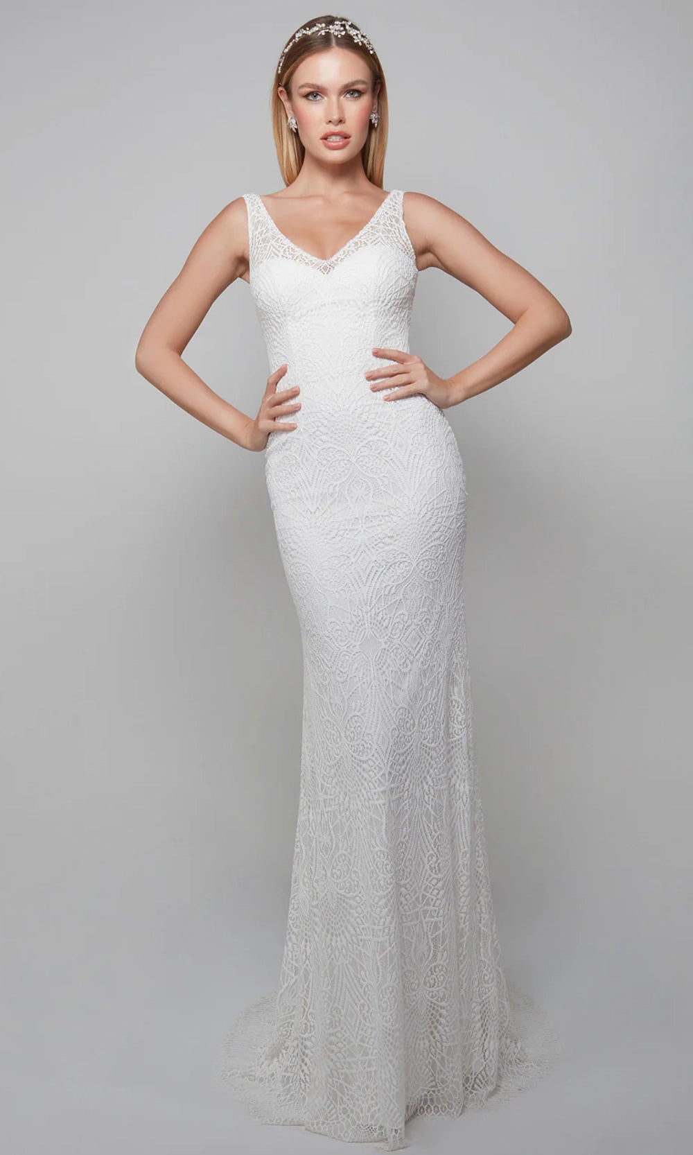 For those who love delicate detail and timeless elegance, the Alyce Paris 7075 style brings your dream gown to life. Made with all-over lace, this long sheath silhouette enhances the figure with a naturally defined waist and graceful V-neckline. The sleeveless design and dramatic scoop back contribute to a refined, romantic look. A sweep train and scalloped lace hem adds just the right amount of drama as it trails behind with poise. Embrace timeless allure in the Alyce Paris 7075 gown, the ideal choice for a sophisticated and memorable celebration. Model is wearing Ivory color.