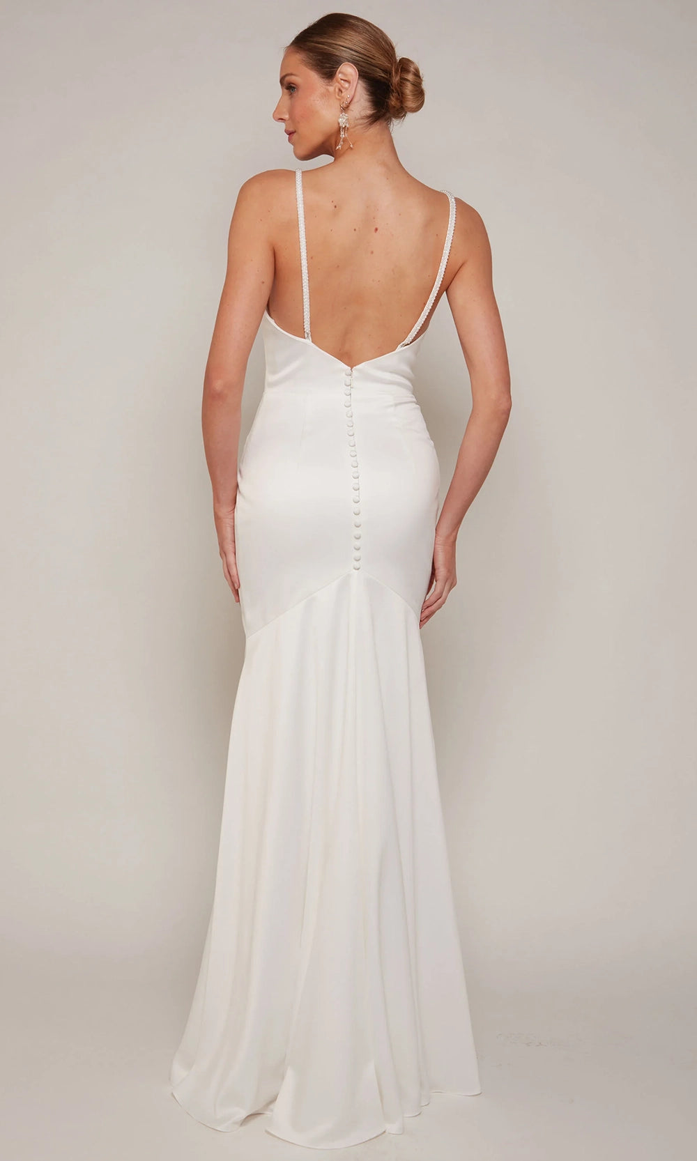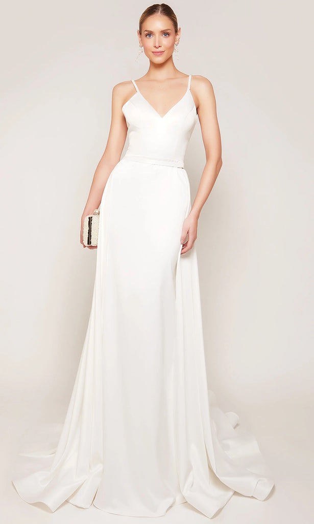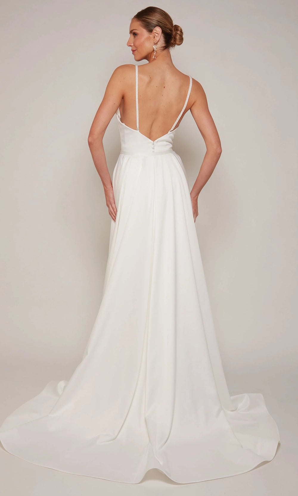 | Details: | Beaded Spaghetti Straps, Detachable Overskirt, Sweep Train, Open Back, Covered Buttons |