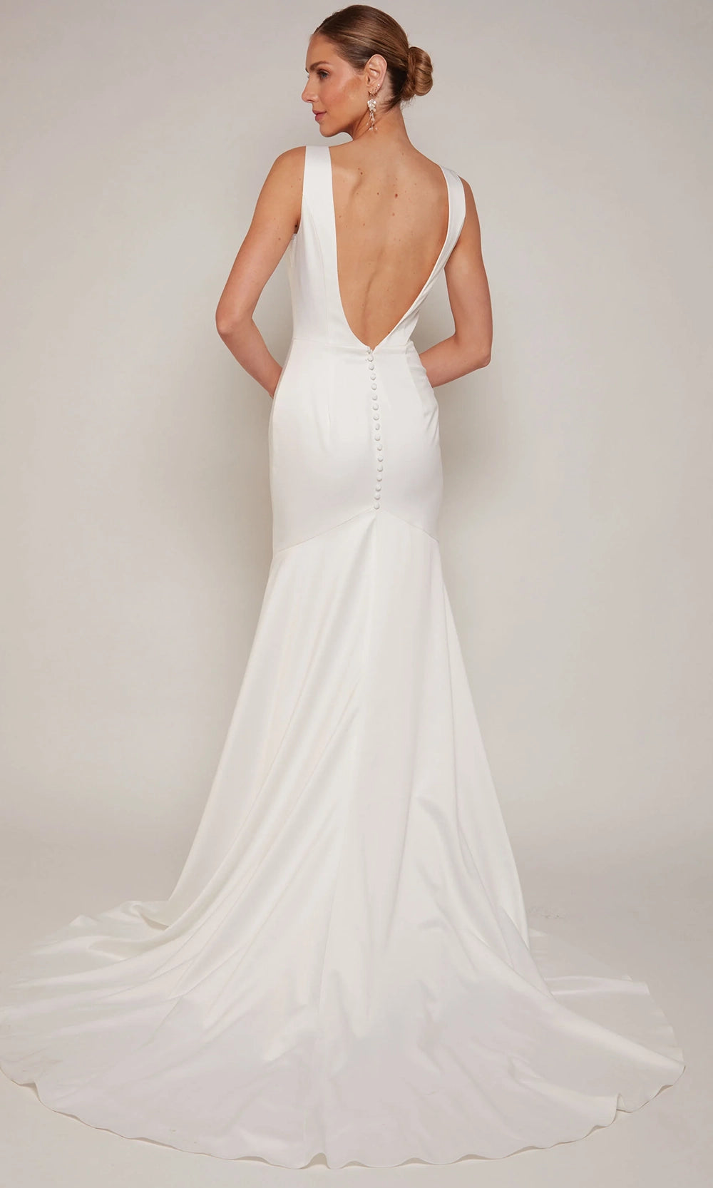 | Details: | Wide Straps, Plain Bodice, High Slit, Low V-Back, Covered Back Buttons, Sweep Train |