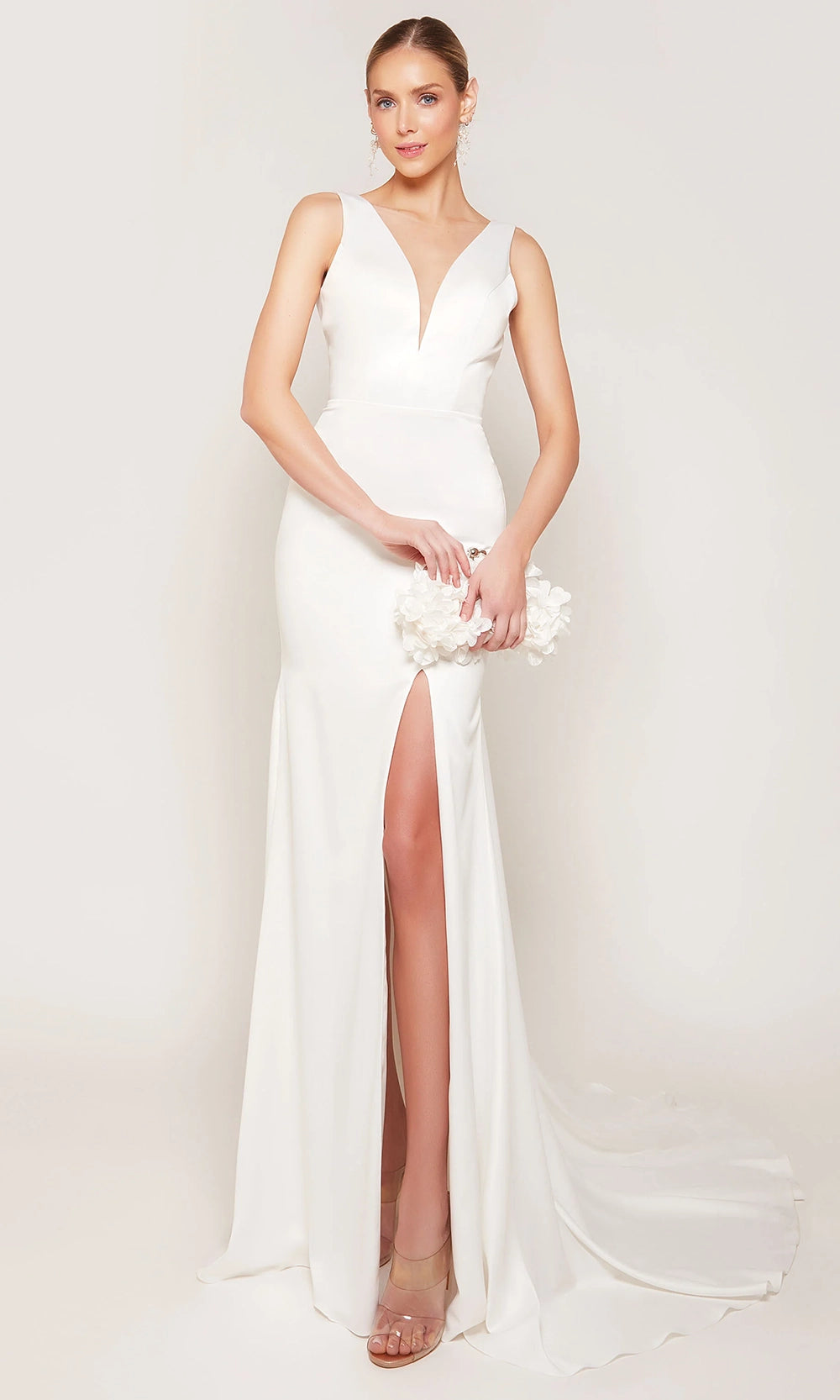 Blending timeless style with modern charm, Alyce Paris 7091 offers a refreshing take on refined bridal fashion. The sleeveless design draws attention with its plunging V-neckline, wide shoulder straps and sleek silhouette that elongates the frame. The fitted bodice transitions into a graceful trumpet flare, accented by a dramatic front high slit that introduces movement and edge. Every seam is placed to contour the body effortlessly. Ideal for those who favor modern design, Alyce Paris 7091 is a compelling choice for a polished fashion-forward appearance that combines simplicity and confidence. Model is wearing Diamond White color.