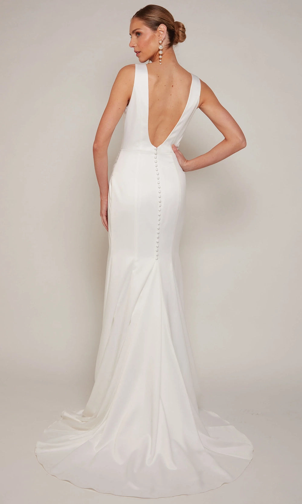 | Details: | Wide Straps, Ruching, High Slit, Open V-Back, Button Closure, Sweep Train |