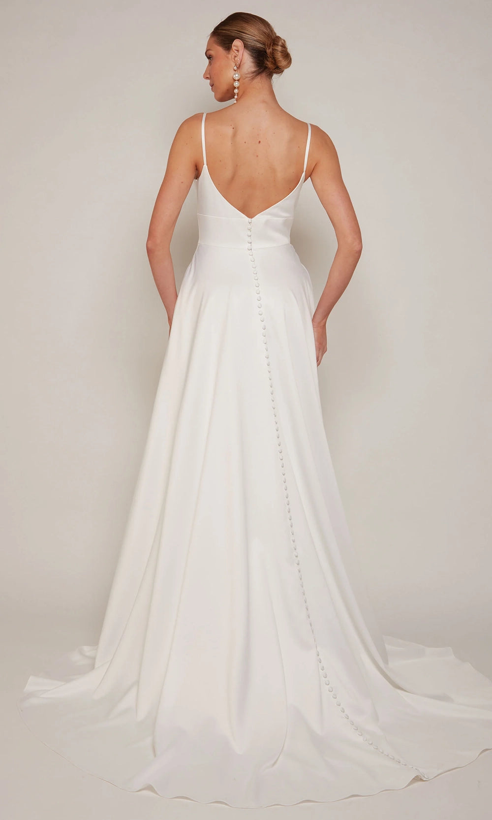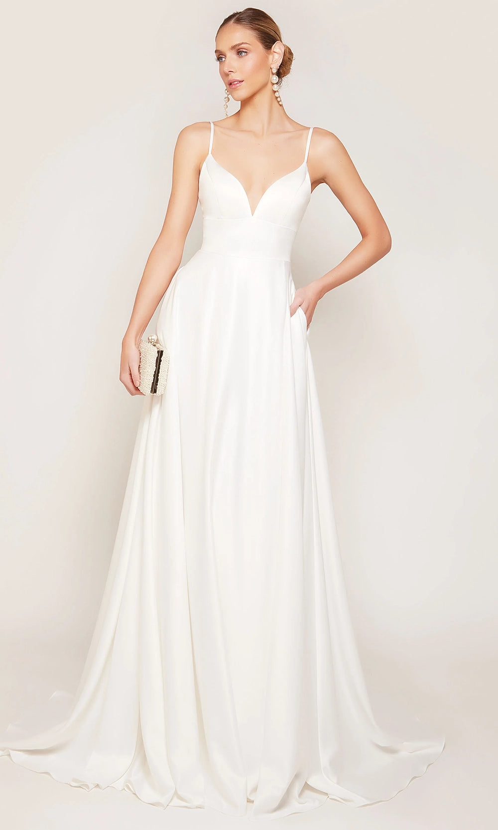 | Details: | Thin Straps, Wide Waistband, Sweep Train, Side Pockets, High Slit, V-Back, Covered Back Buttons |