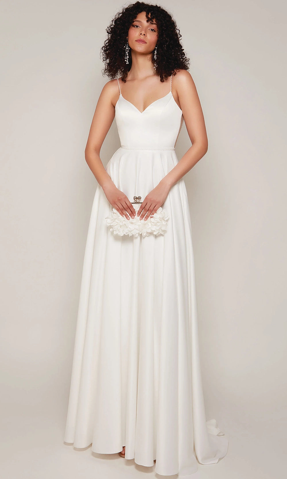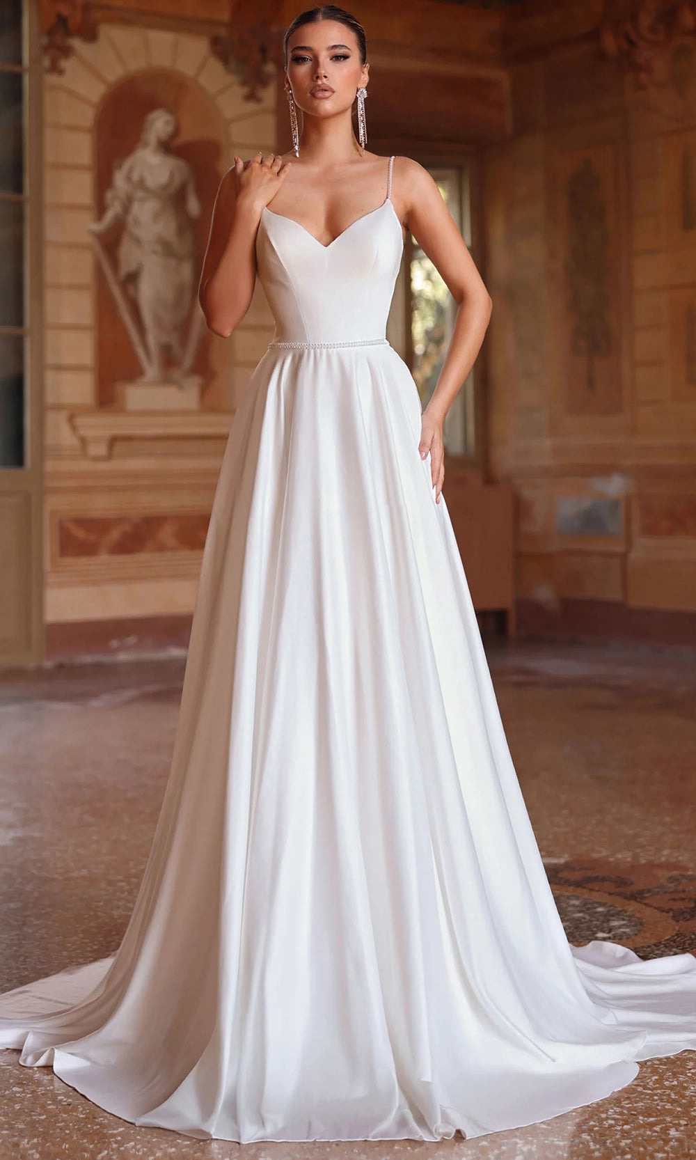 A refreshing take on understated elegance, Alyce Paris 7099 bridal dress flatters with its graceful A-line silhouette and uncomplicated charm. The deep v-neckline provides soft structure, complemented by beaded spaghetti straps and defined beaded thin waistband that leads into a gentle A-line skirt. The back reveals an illusion scoop framed by covered buttons leading into a soft sweep train. This gown allows for effortless styling and movement, creating a poised and polished impression. Alyce Paris 7099 is ideal for those seeking refined simplicity and flattering femininity. Model is wearing Diamond White color.