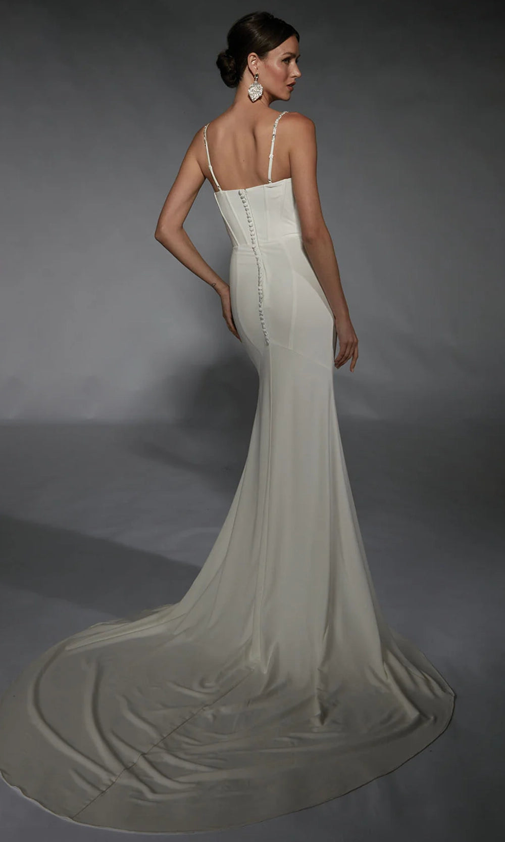 | Details: | Beaded Spaghetti Straps, Corset Boning Bodice, Ruching, High Slit, Chapel Train, Covered Back Buttons |