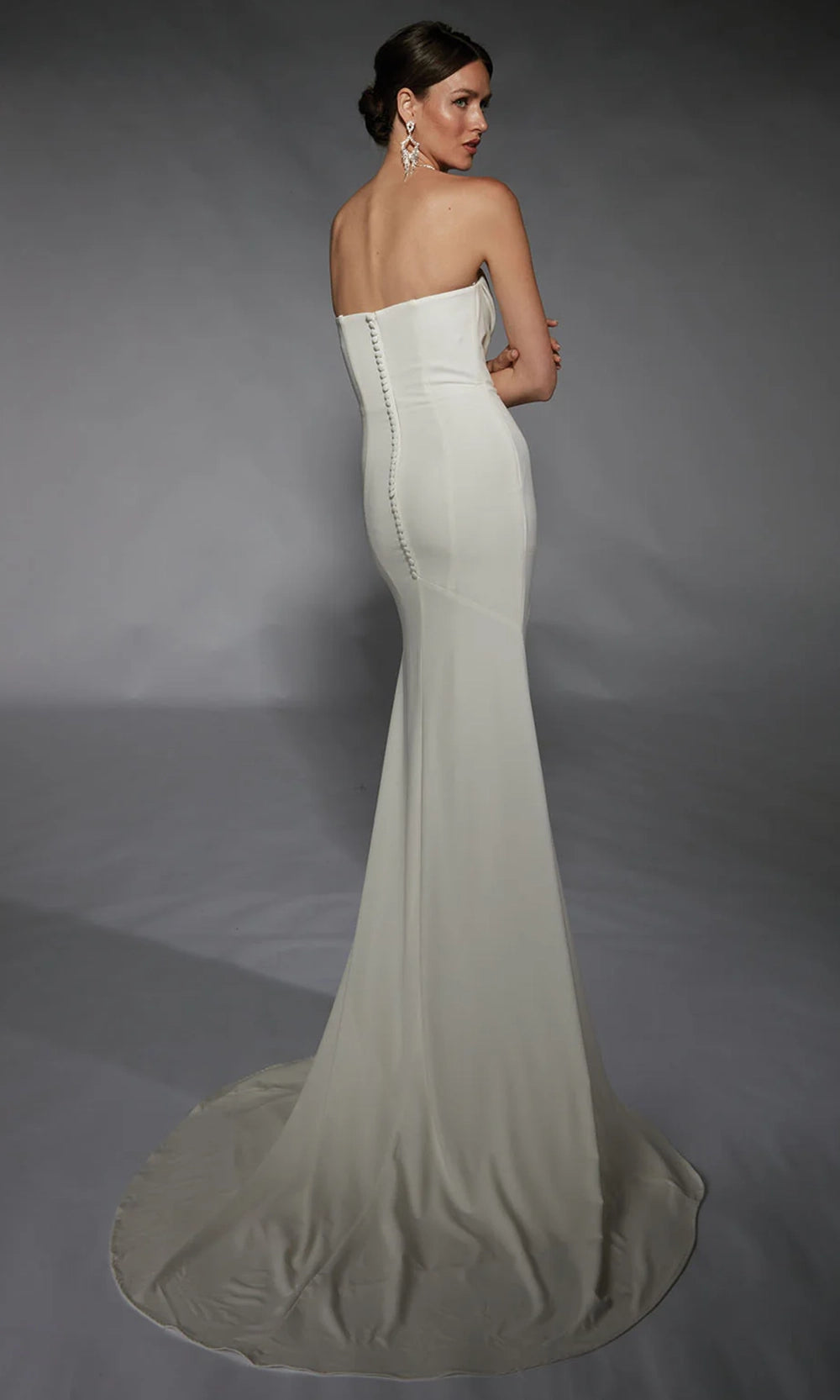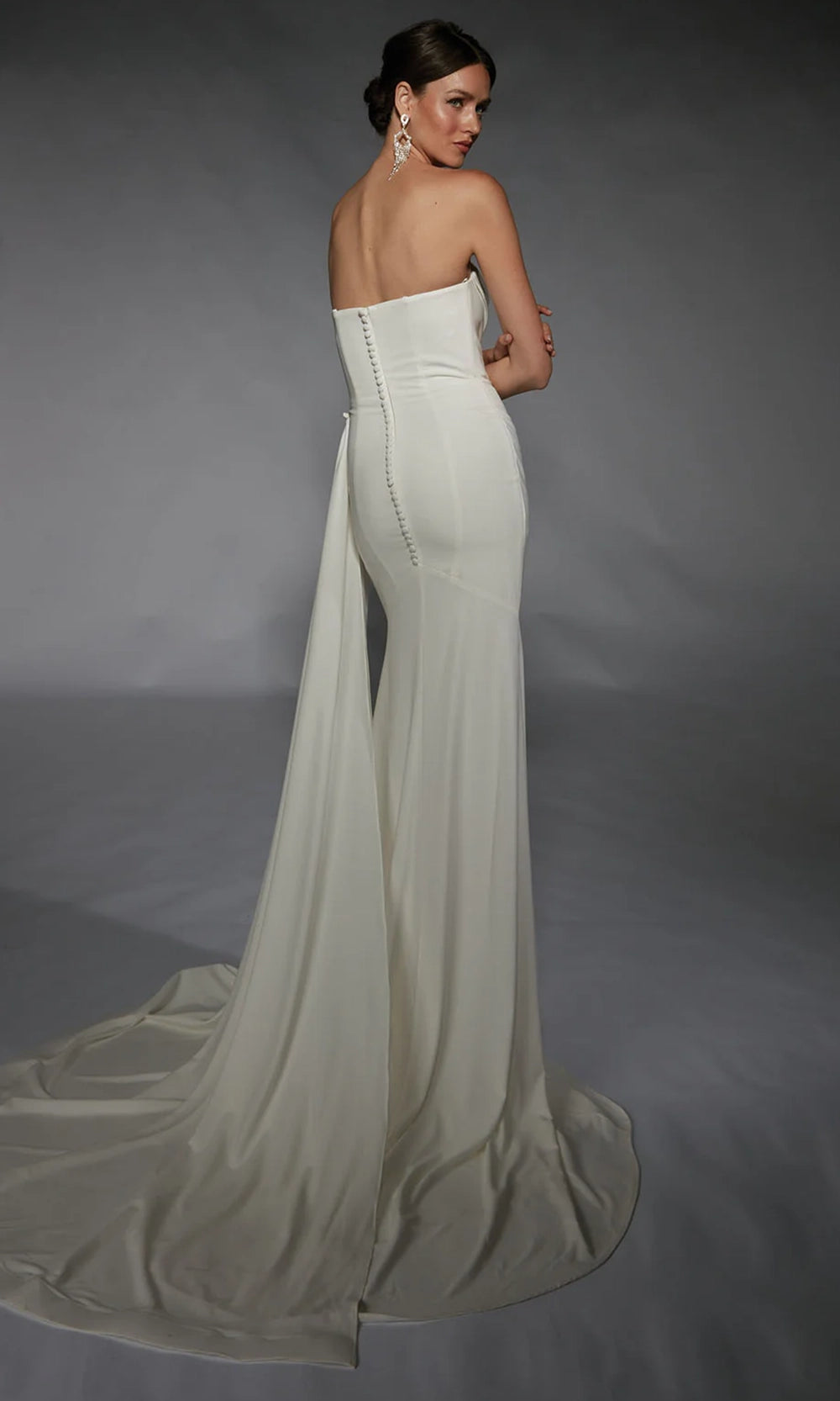 | Details: | Strapless Bodice, Detachable Side Overskirt, High Slit, Sweep Train, Covered Back Buttons |