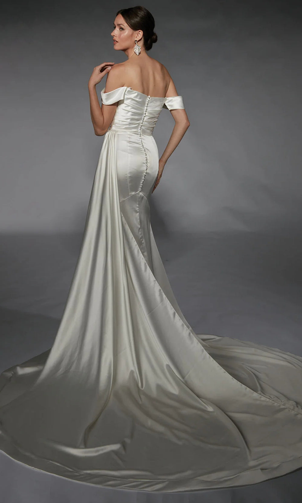 | Details: | Strapless, Ruching, Detachable Side Overskirt And Off-Shoulder Sleeves, High Slit, Chapel Train, Covered Back Buttons |