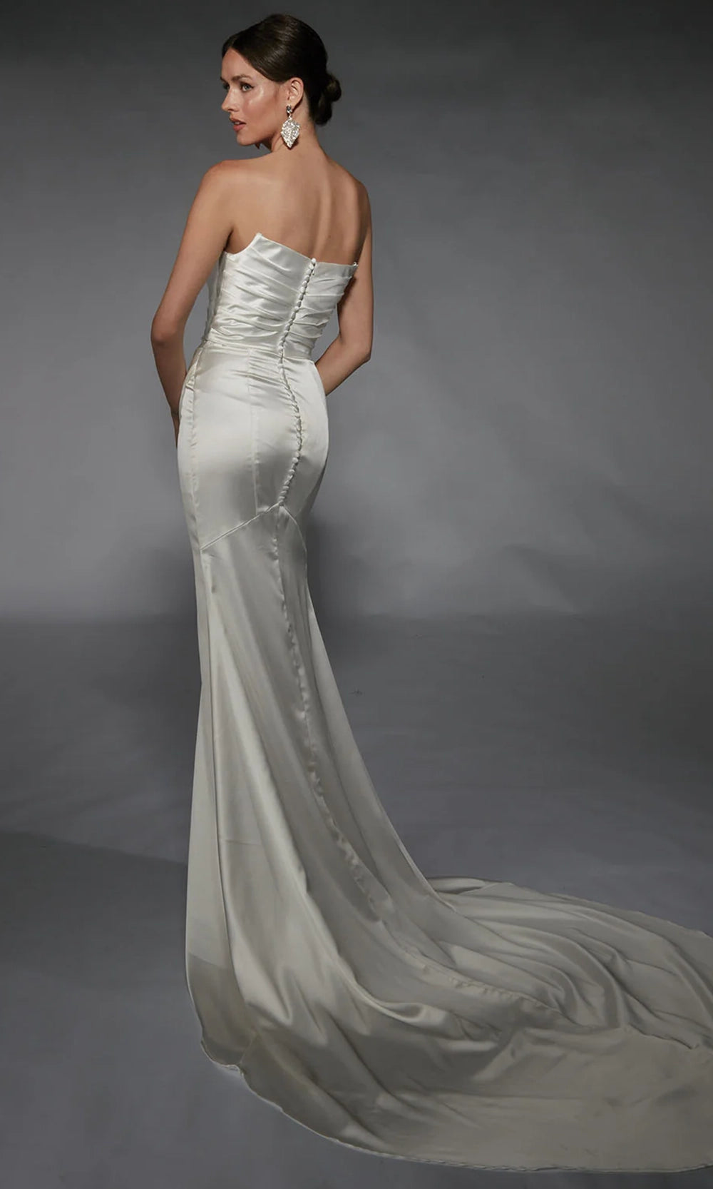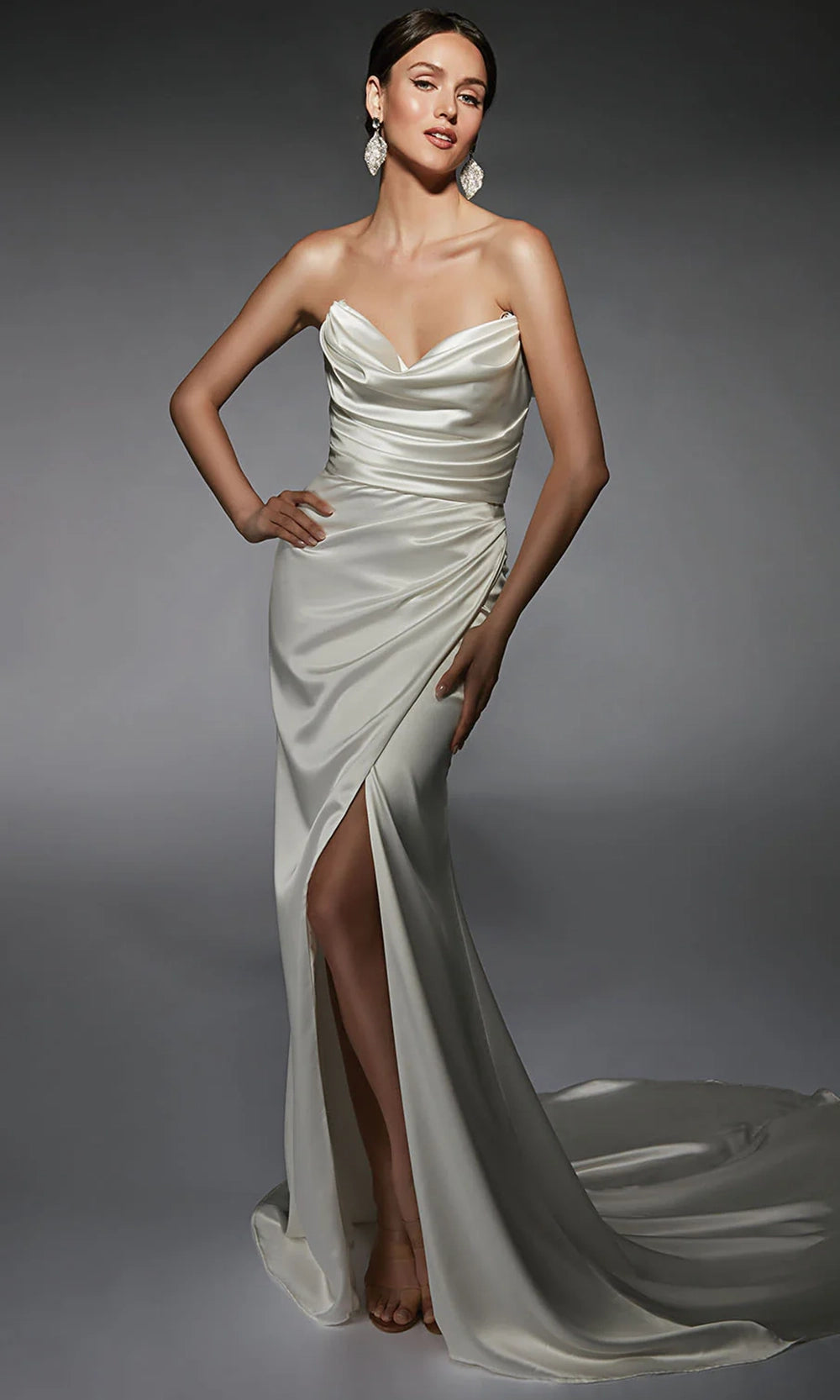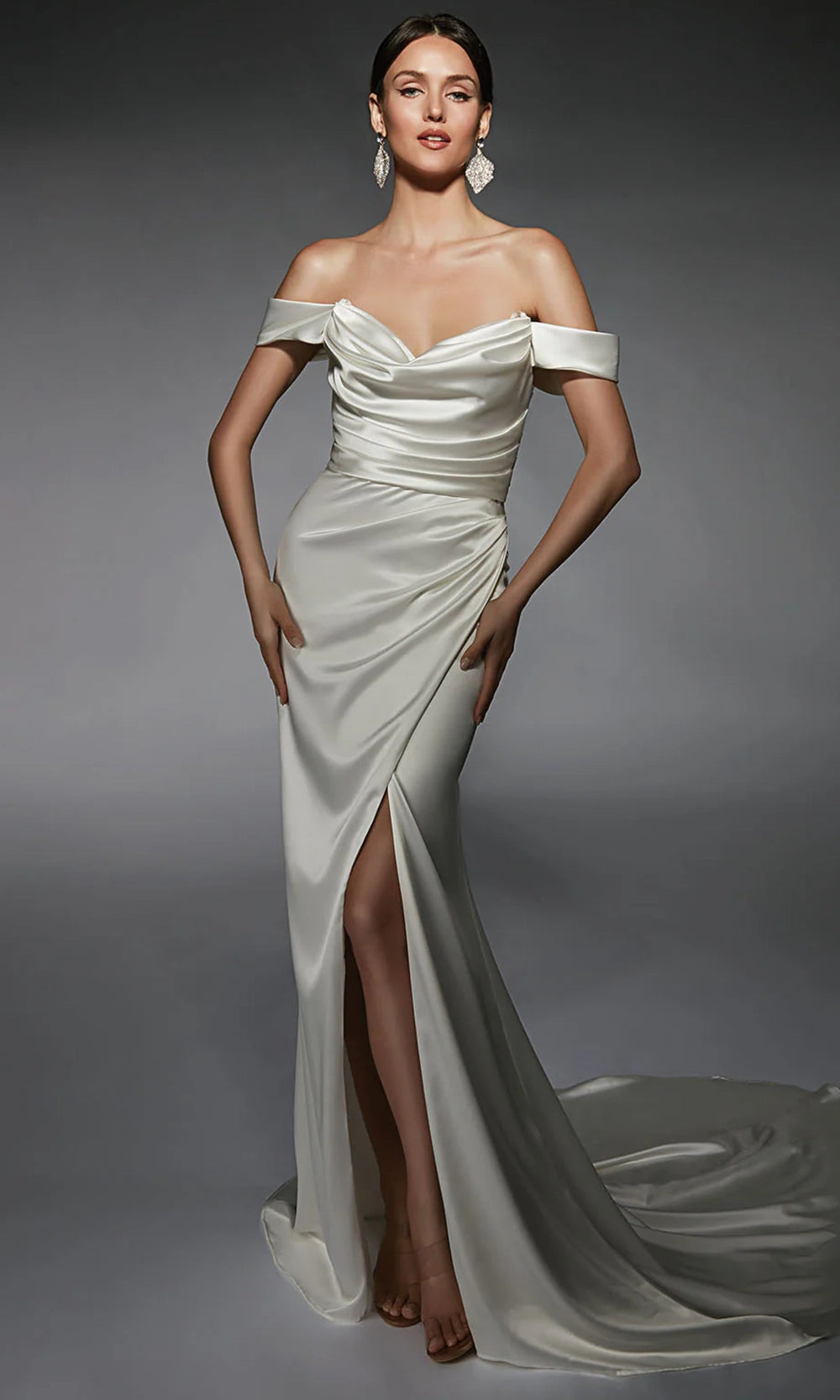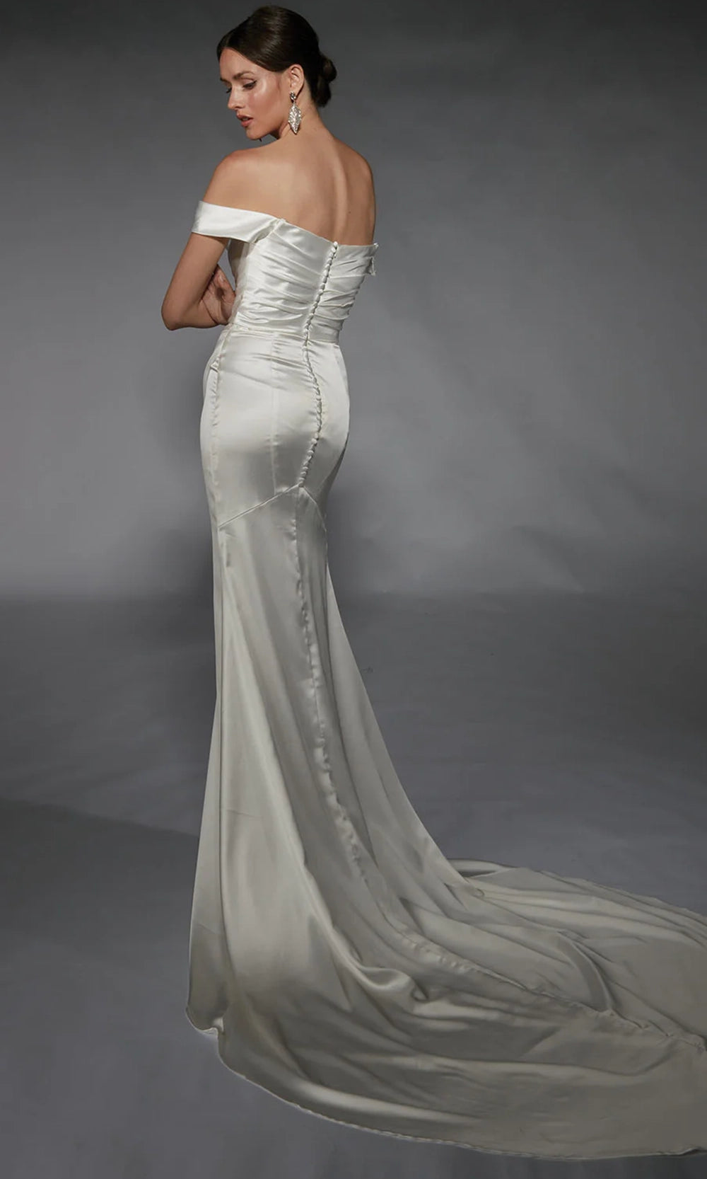 Elegance meets allure in the Alyce Paris 7106, a gown crafted to highlight every refined curve with precision. This sleek silhouette is defined by a romantic cowl neckline and a ruched waist that draws the eye to the figure natural curve. The silhouette flows effortlessly with a sheath skirt accented by a side slit and a statement-making sweep train. Detachable elements like the side overskirt and off-shoulder sleeves allow for customizable styling throughout the celebration. Finished with rich structure and clean lines, the Alyce Paris 7106 is perfect for those who want an effortlessly luxurious and contemporary look with sophisticated drama. Model is wearing Ivory color.