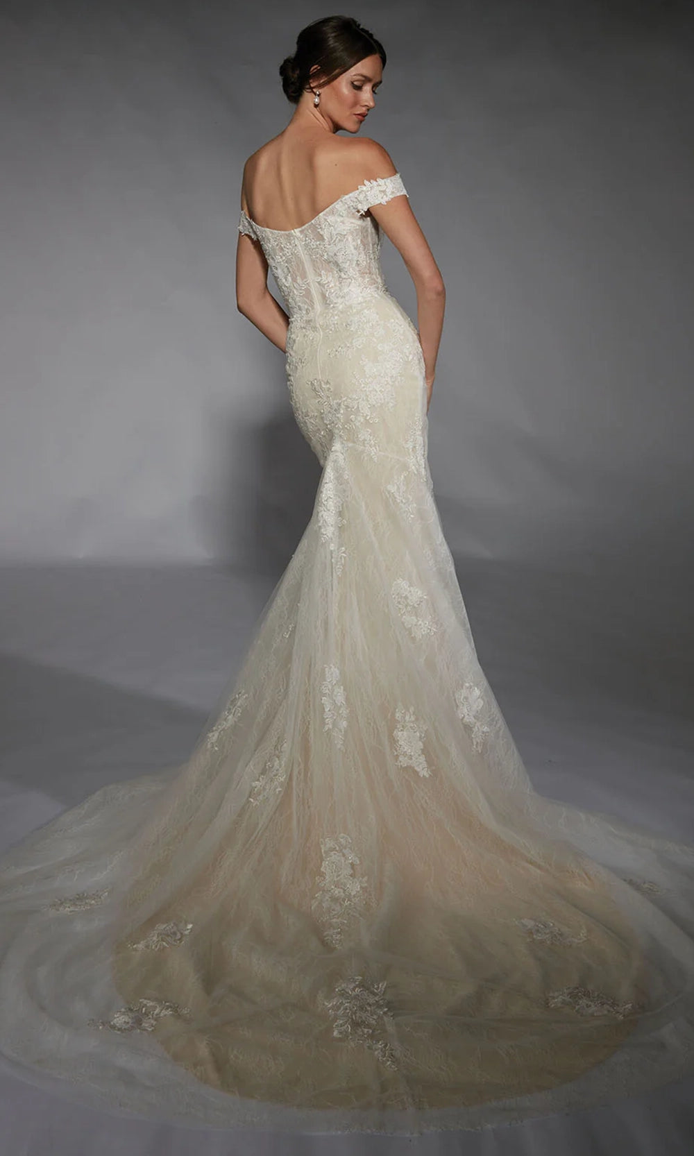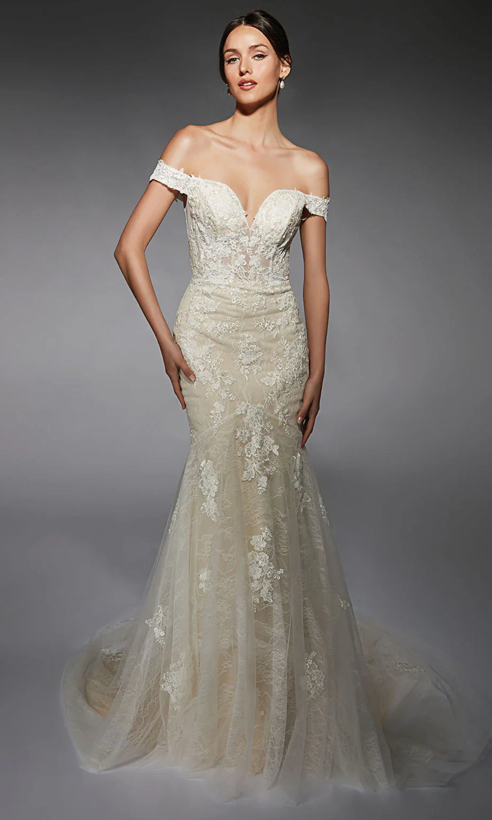 Romantic detailing and sophisticated structure blend seamlessly in Alyce Paris 7118. This off-shoulder gown features a sheer lace bodice that flows effortlessly into a fit and flare silhouette. Delicate floral appliques scatter across the lace and tulle fabric, adding texture and dimension from bodice to train. The structured waistline offers definition, while the soft sweep at the hem balances formality with elegance. Alyce Paris 7118 trumpet gown is made for moments that demand timeless charm with a modern edge, perfect for making a graceful and stylish impression. Model is wearing Ivory-Champagne color.
