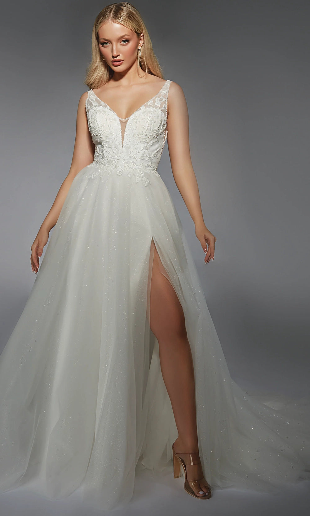 Gracefully blending sophistication with contemporary design, the Alyce Paris 7125 showcases a beaded lace bodice that enhances its plunging V-neckline. A sheer tulle overlay adds dimension to the skirt, giving this A-line dress an ethereal appearance. With a daring side slit that brings modern flair, this style flatters through its flowing lines and natural waist. Ideal for anyone wanting a look that feels refined yet current, Alyce Paris 7125 is a confident choice that balances structure and softness. The shimmering detail adds movement and elegance to every step. Model is wearing Ivory color.
