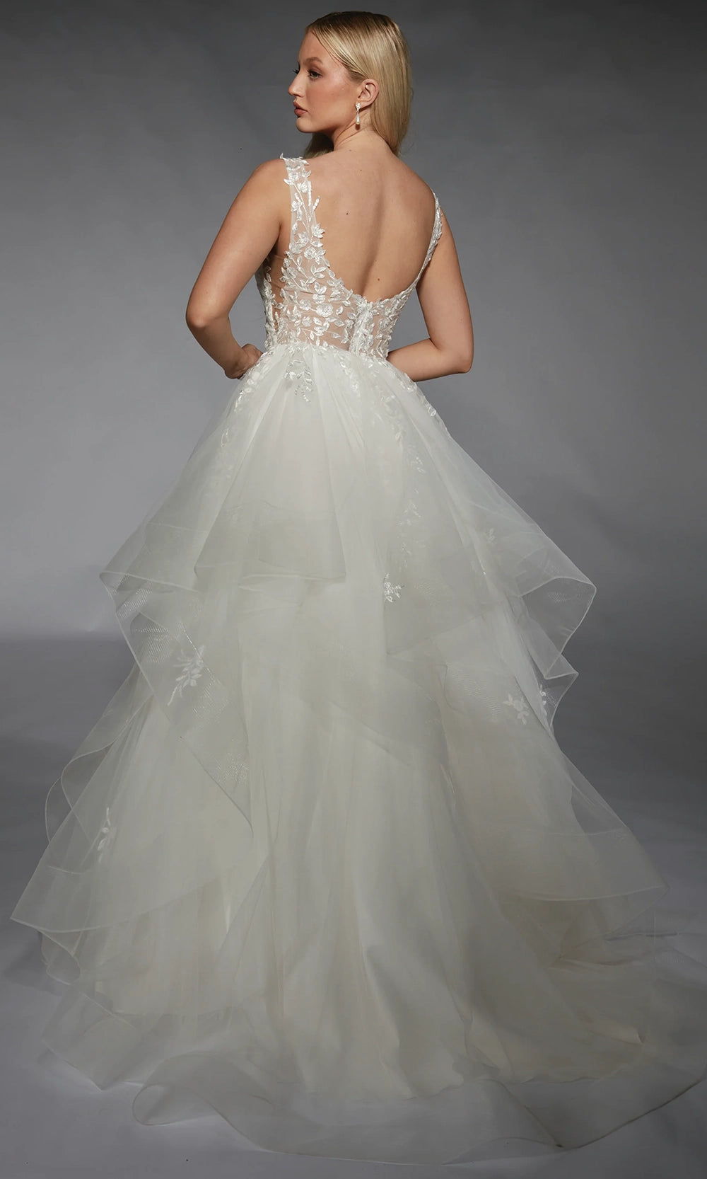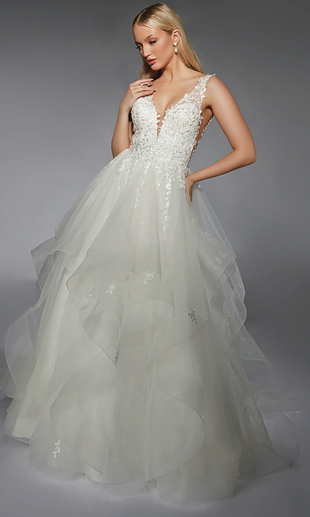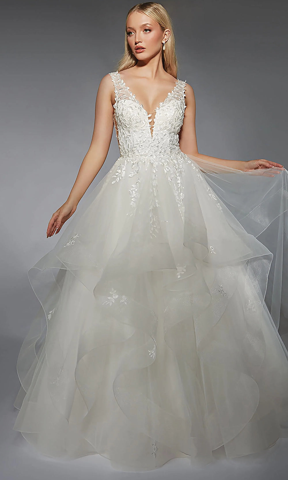 For a breathtaking look that feels regal and modern, Alyce Paris 7126 offers a stunning layered ballgown silhouette with floral applique throughout. The bodice features a plunging V-neckline and illusion side panels, creating a structured yet delicate appearance. Layers of tulle cascade into a voluminous skirt with a horsehair hem, providing dimension and drama. The mix of sheer and opaque elements adds interest and subtle drama. Alyce Paris 7126 balances elegance with innovation, making it an unforgettable statement for those who love texture, detail, and sweeping design. Model is wearing Ivory color.