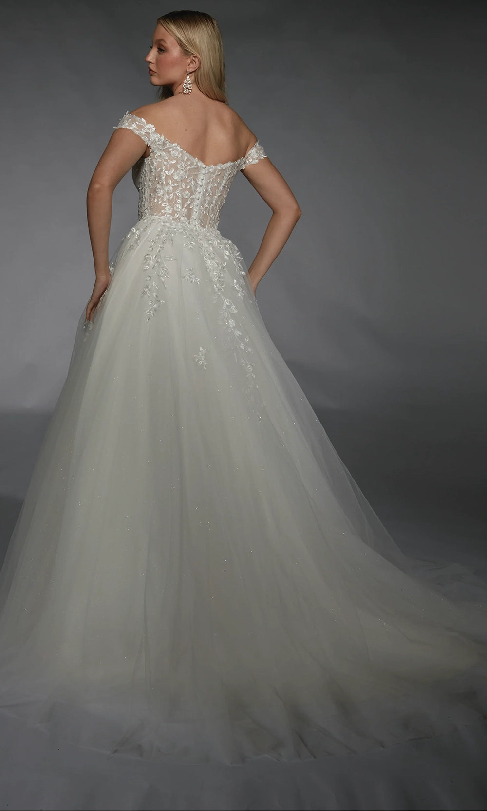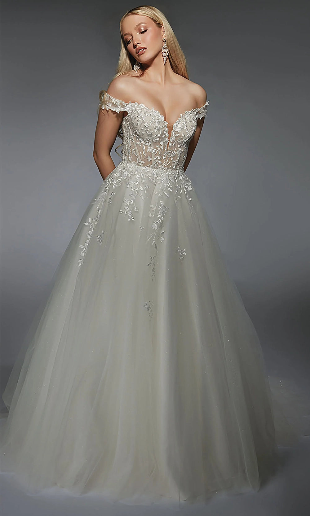 Timeless elegance meets shimmering design in Rachel Allan 7129 a gown meant to dazzle at every turn. The romantic off-shoulder sweetheart neckline complements a sheer corset-style bodice adorned with floral lace appliques. Its layered tulle A-line skirt shimmers with embedded sparkle adding grandeur to your silhouette. This gown is a seamless blend of classic fantasy and contemporary craftsmanship. Rachel Allan 7129 is a perfect match for those who seek a statement-making style with unforgettable grace. Model is wearing Ivory color.