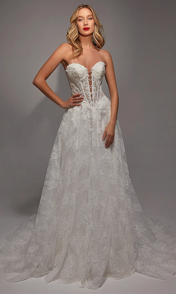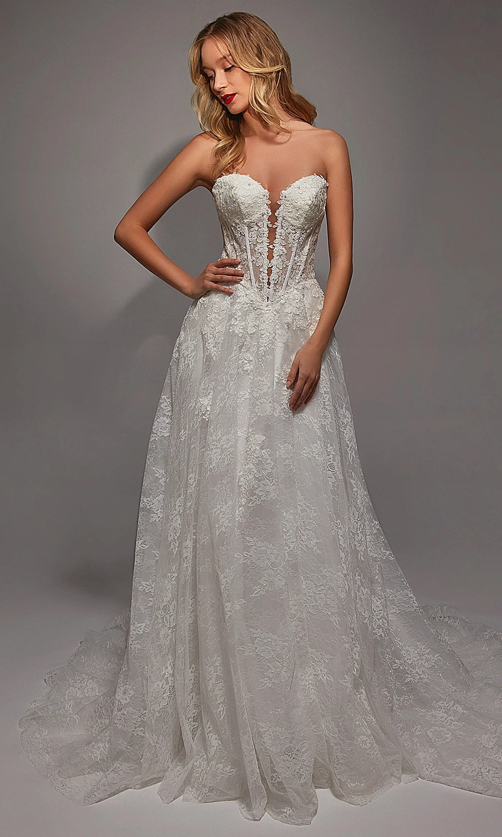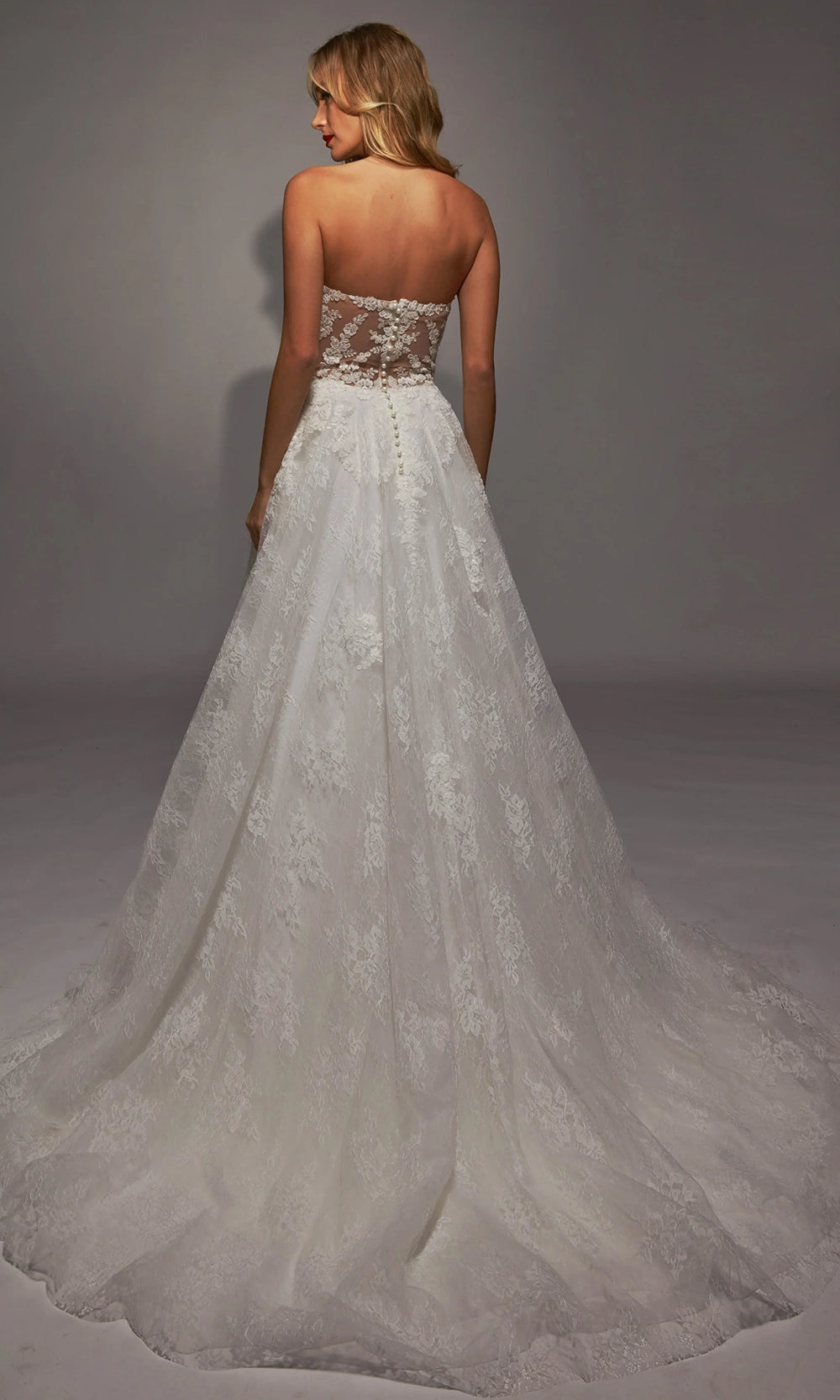 | Details: | Strapless sweetheart neckline, sheer corset bodice, lace applique embellishment, A-line skirt, illusion back with button accents, chapel-style train |