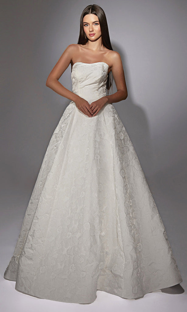 | Details: | Strapless, Full Floral Texture, Open Back, Concealed Back Zipper, Sweep Train, Pockets |