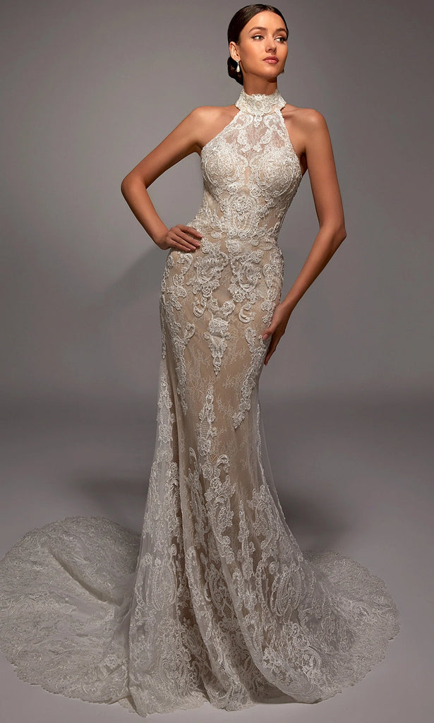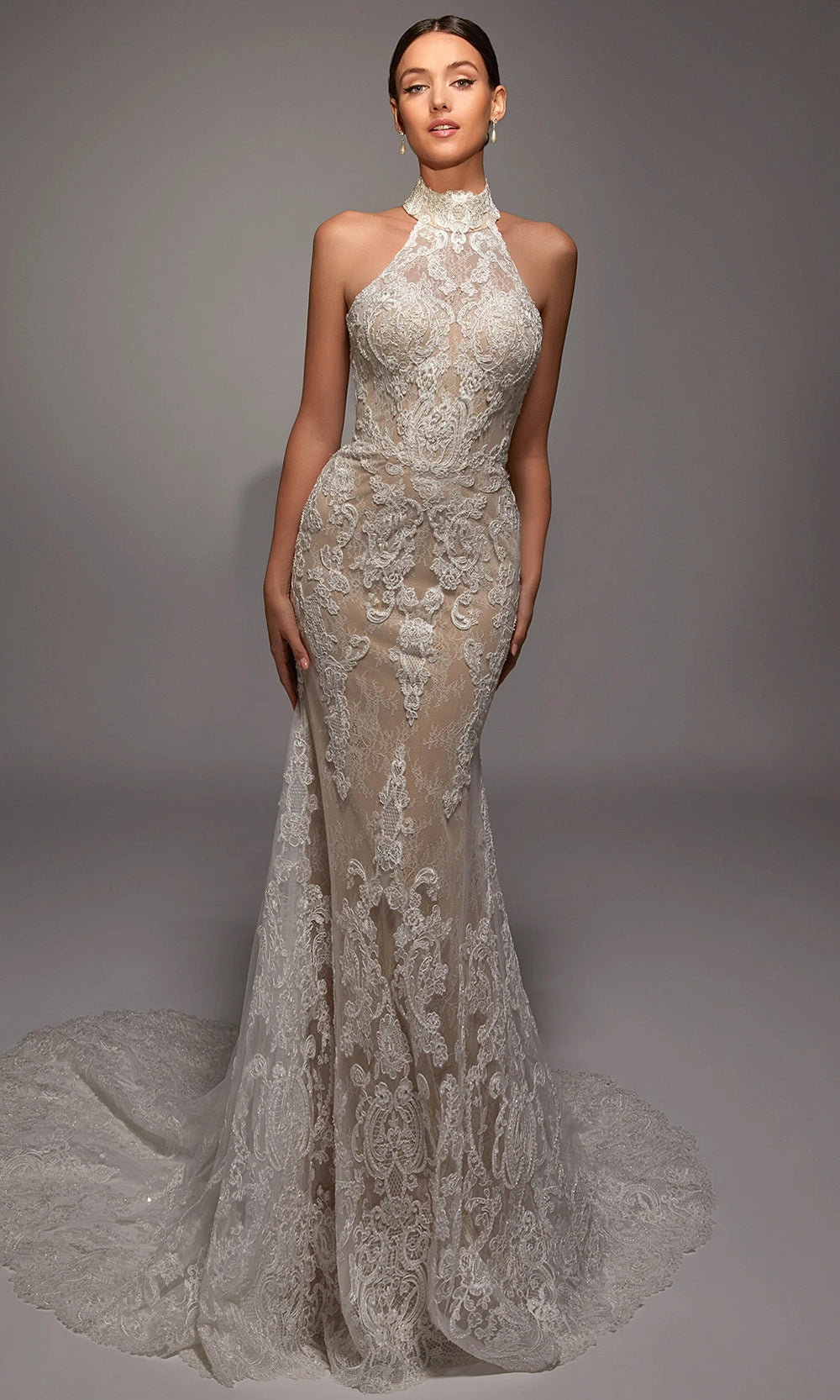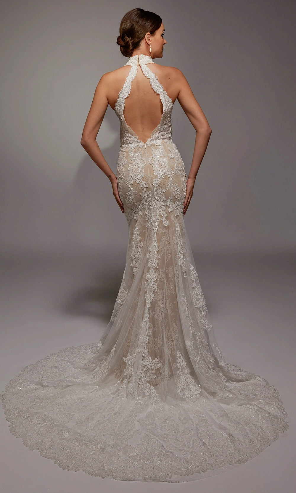 | Details: | High neckline, illusion lace bodice, fitted mermaid silhouette, open back, chapel train, lace applique |