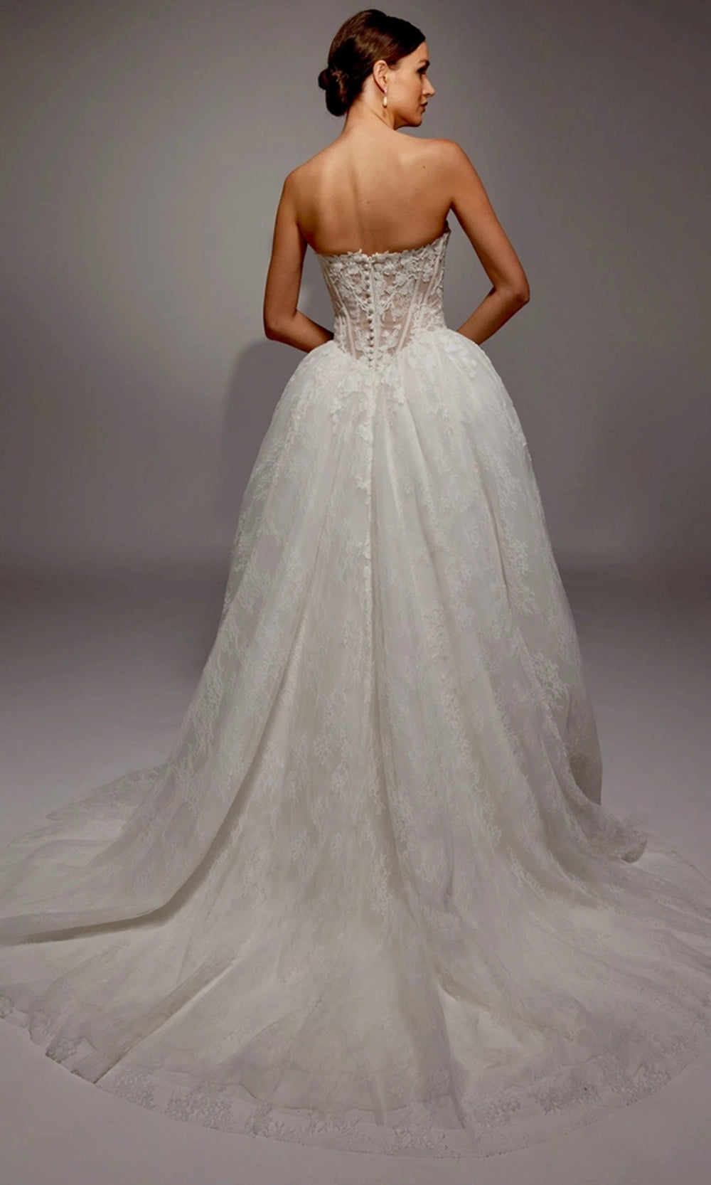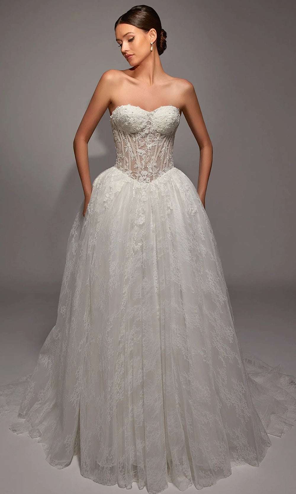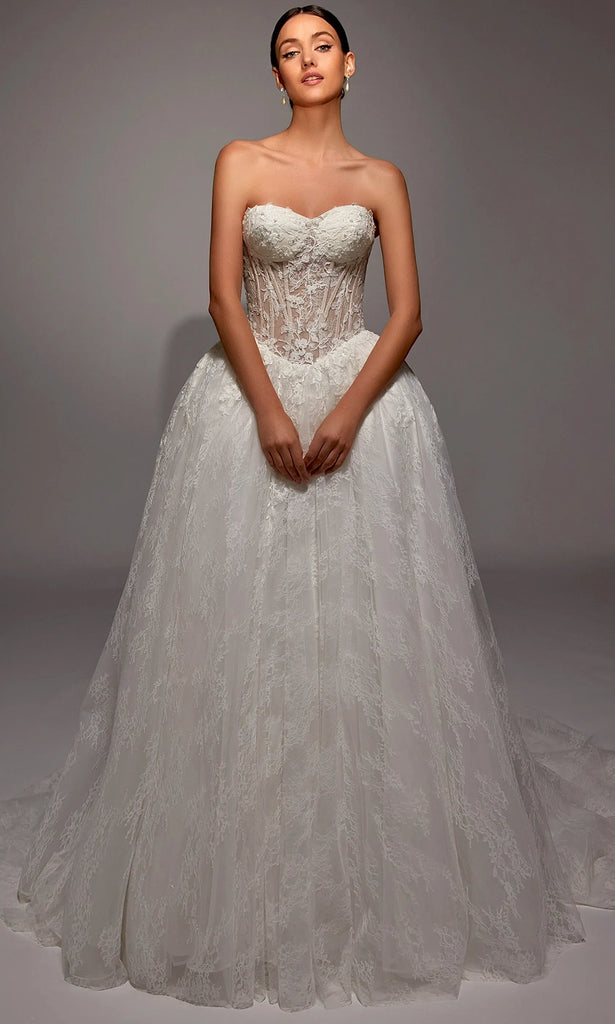 | Details: | Strapless sheer corset bodice, floral applique accents, lace ball gown skirt, chapel train |