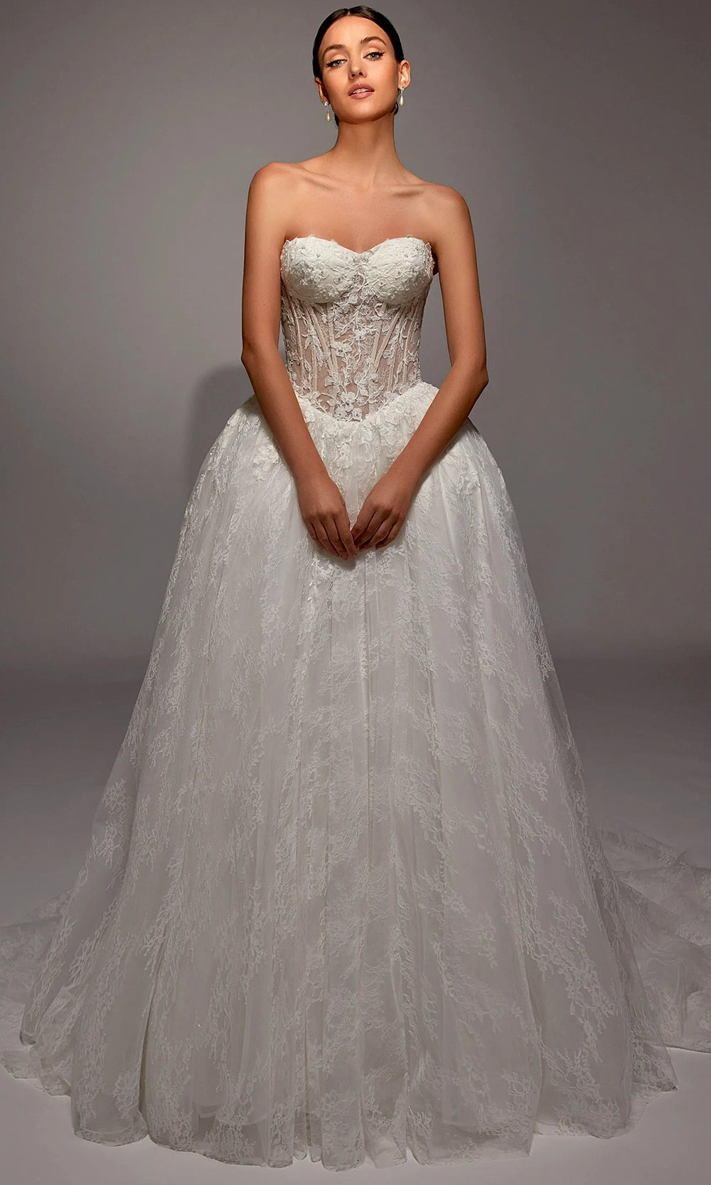 Experience a breathtaking entrance with the Alyce Paris style 7163, a masterpiece created for grand celebrations. Its strapless sheer corset bodice shapes the silhouette beautifully, adorned with elegant floral applique accents that add delicate texture. The voluminous lace ball gown skirt creates a dreamy finish, cascading into an exquisite chapel train designed for dramatic moments. Whether walking down an aisle or taking center stage at a formal event, the luxury and grace of Alyce Paris style 7163 make it an unforgettable choice for your most cherished occasion. Model is wearing Ivory/Sand color.