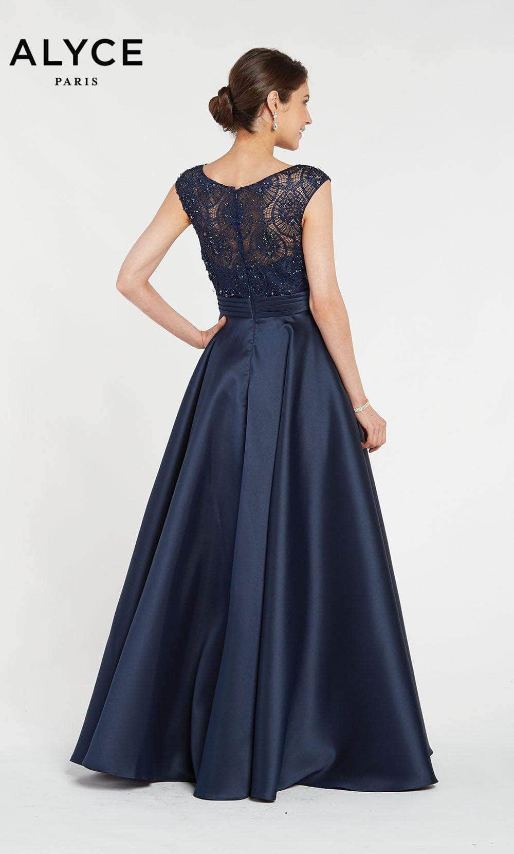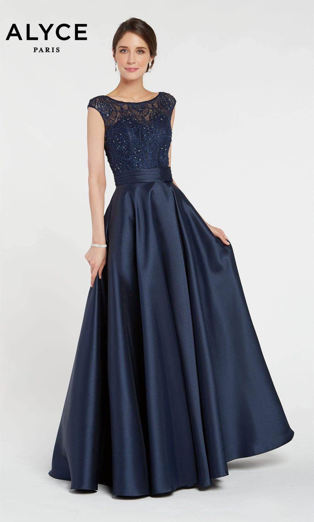 This Mikado formal dress features a fitted bodice with cap sleeves edging the bateau neckline and lovely lace overlay with beaded design throughout. A pleated cummerbund leads the flared long skirt, creating a classic A-line silhouette with in-seam pockets. Model is wearing Midnight color.