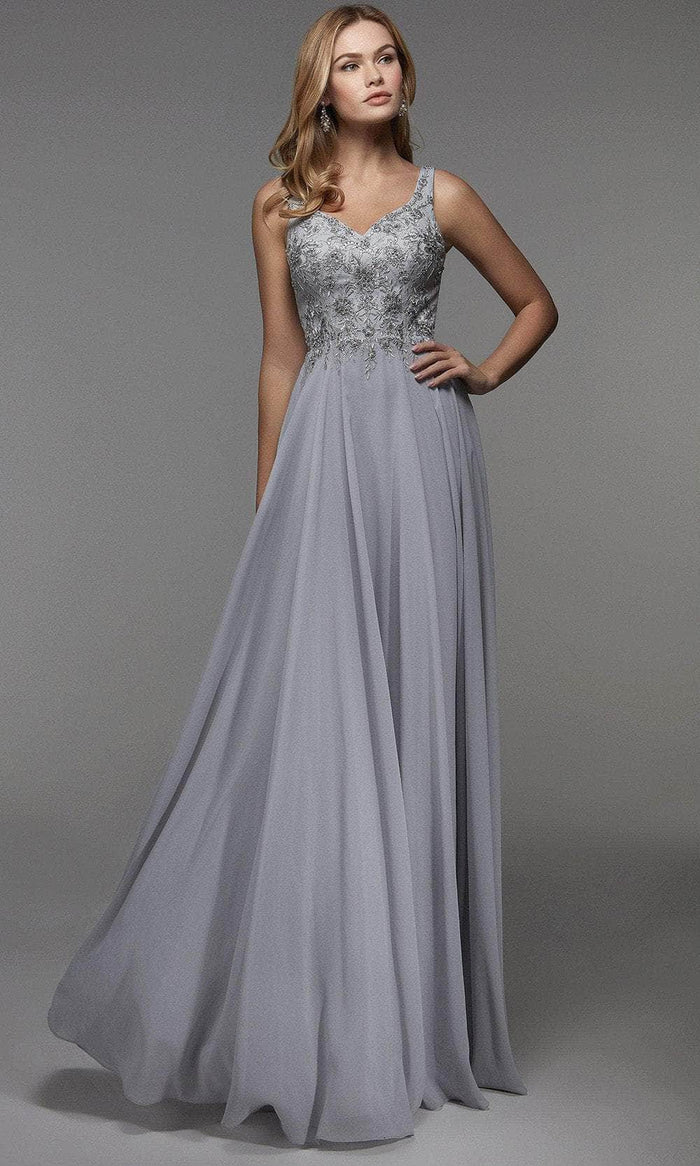 Embroidered with gorgeous lace details on the fitted bodice, this sleeveless beauty features a V-neckline with equally charming V-shaped mid-open back and it is secured with a zipper closure. Nipped from the waist, the flowy A-line tulle skirt cascades elegantly down to a full-length hemline. Model is wearing the Sterling color.