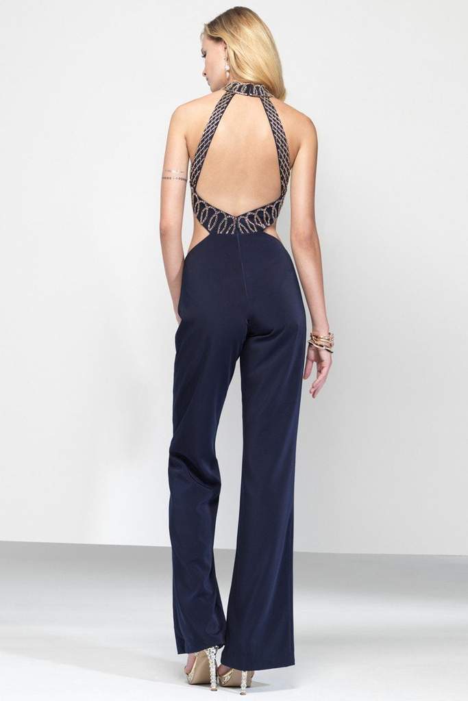 This trendsetting style features a sleeveless, high halter neckline and embellished lattice beadwork on the bodice. The sides have midriff cutouts while the back has a framed open back detail. A full length tapered pants completes the sophisticated look of this chic jumpsuit. Model is wearing Navy color.