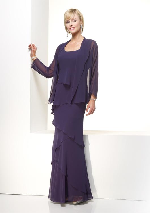 This Mother of the Bride chiffon dress has a sleeveless, scoop neckline bodice with an asymmetrical tiered floor-length skirt. This gown comes with a matching long-sleeved jacket.