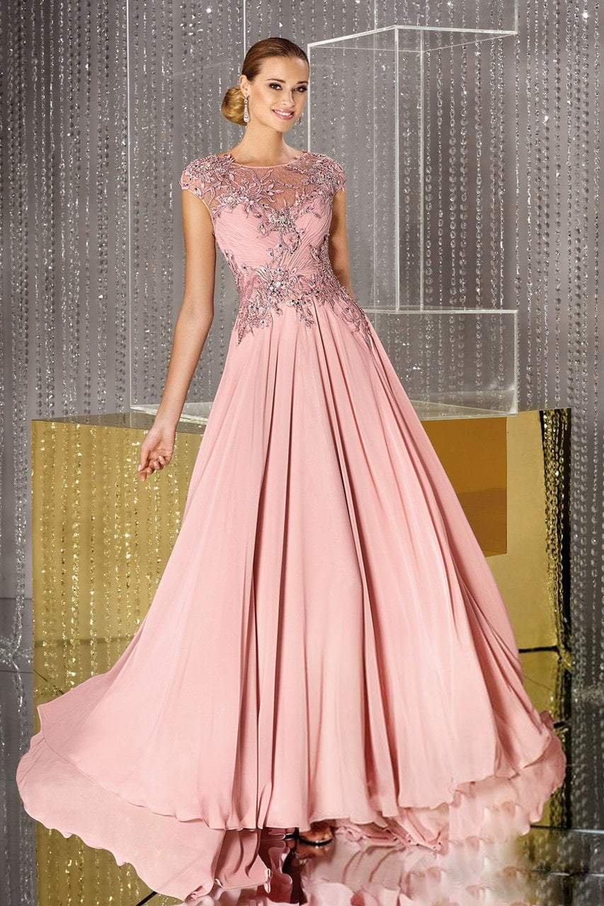 Short sleeve beaded lace and chiffon A-line long dress with sheer neckline. Asymmetrical pleated bodice with beaded jeweled sequined embroidered lace and tulle around the front and back. Flowing layered chiffon skirt with sweep train. No shawl.
