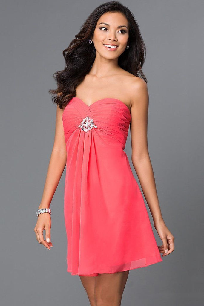 | Details: | Strapless, Pleated Bust, Rhinestone Brooch, Short Hem, Chiffon, Mid Open Back, Back Straps, Back Cut Outs, Back Zipper |