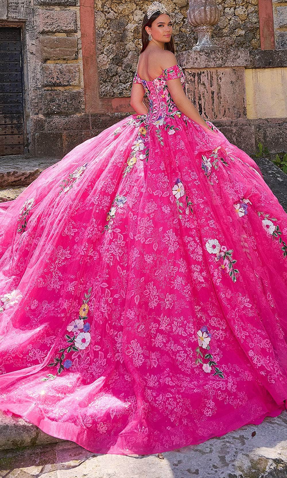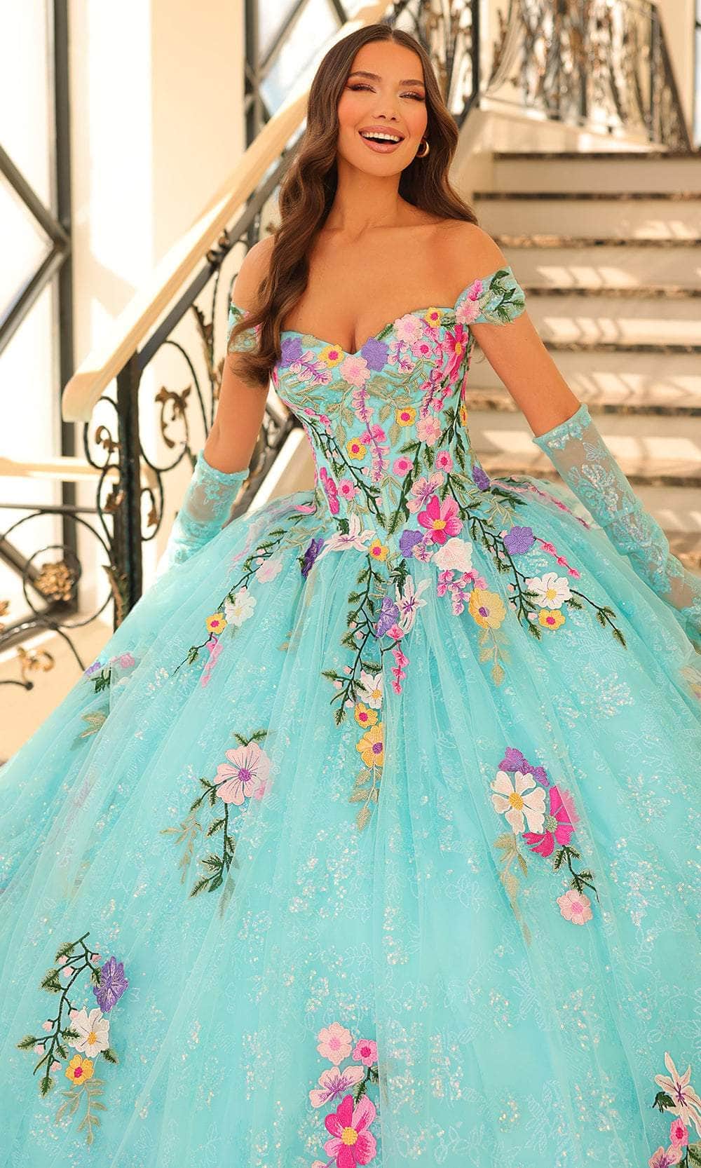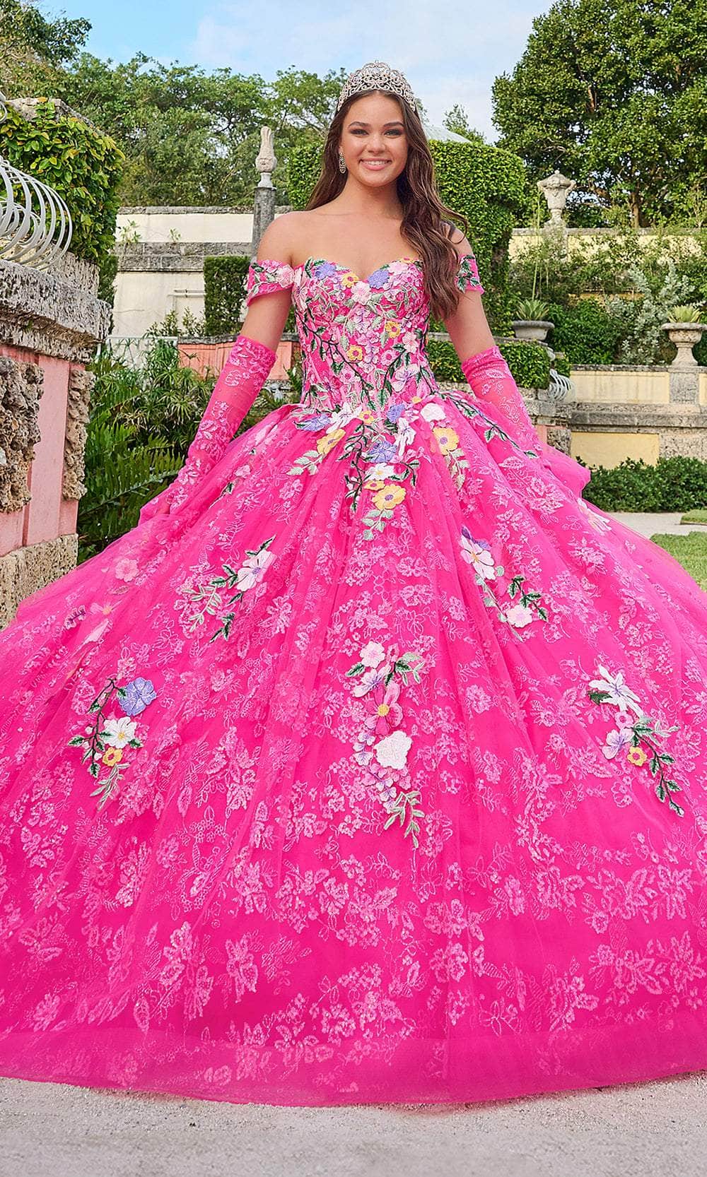 With this stunning quinceañera gown, Amarra 54200, which exudes romance and playfulness, all attention will be on you. Made from the softest tulle and embellished with exquisite flower embroidery, this work of art has an elegant off-the-shoulder sweetheart neckline. Your shape is accentuated by the tailored natural waistline, and you have a regal profile thanks to the full-length ball gown style enveloping layers of luxury fabric. This Amarra 54200 is ideal for your quinceañera or any other special occasion, since it promises to take you to a realm of enchantment and wonder where dreams come true. Models are wearing Aqua/Multi and Fuchsia/Multi colors.