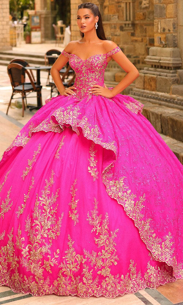 Step into your dream fairy-tale moment with this Amarra 54235 masterpiece. The gown is adorned with luxurious gold lace embroidery, featuring scalloped lace detailing on the edges for added style and charm. It also offers off-shoulder cap sleeves, and a sweetheart neckline that beautifully accentuates your decolletage. The skirt reveals a unique overlay that enriches its dimension, resulting in a voluminous ballgown silhouette that trails into a petal-shaped chapel train. The mid-open back detail introduces an element of allure, perfectly finished with a lace-up tie closure and a dramatic oversized bow. Instantly captivate attention in this Amarra 54235 gown. Models are wearing Fuchsia, and Navy colors.