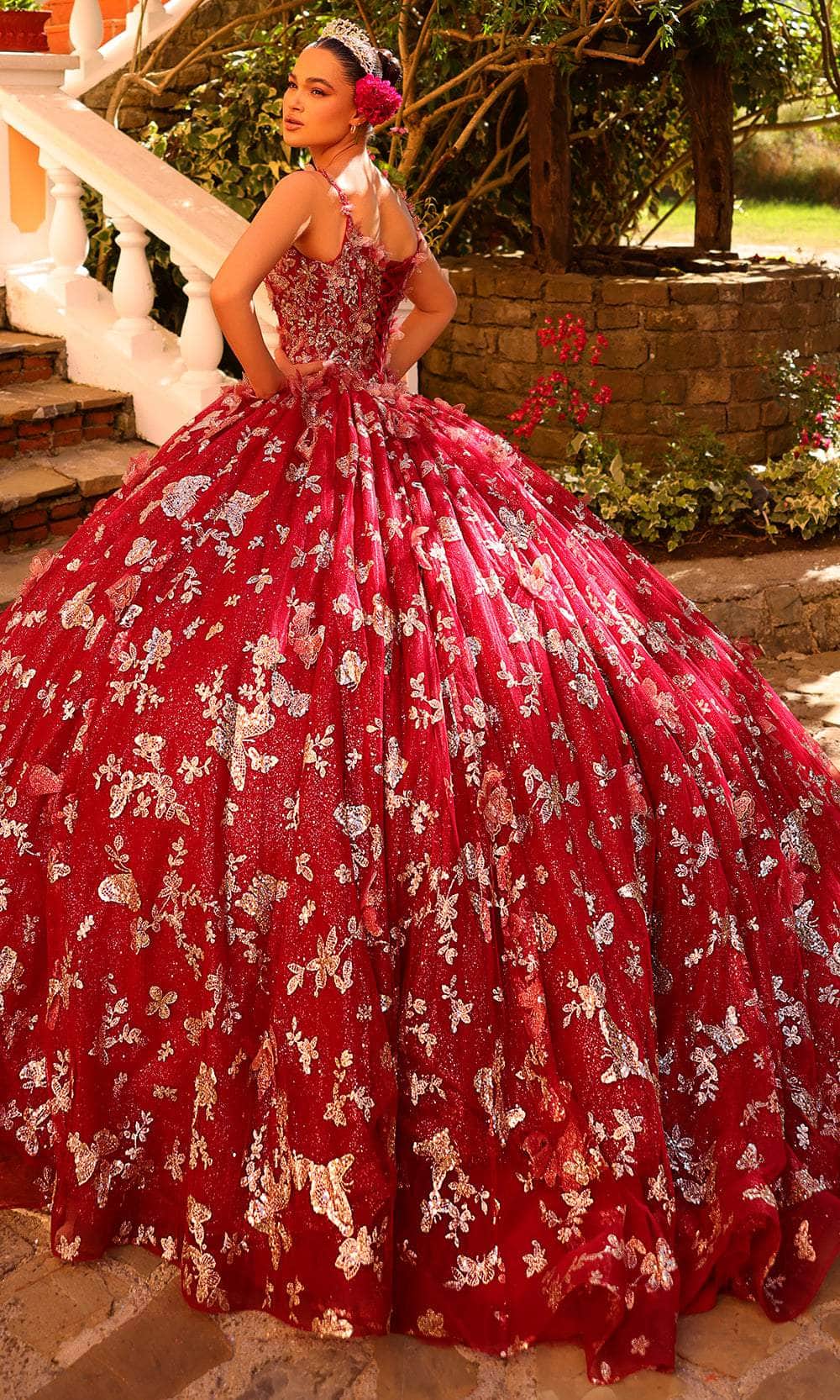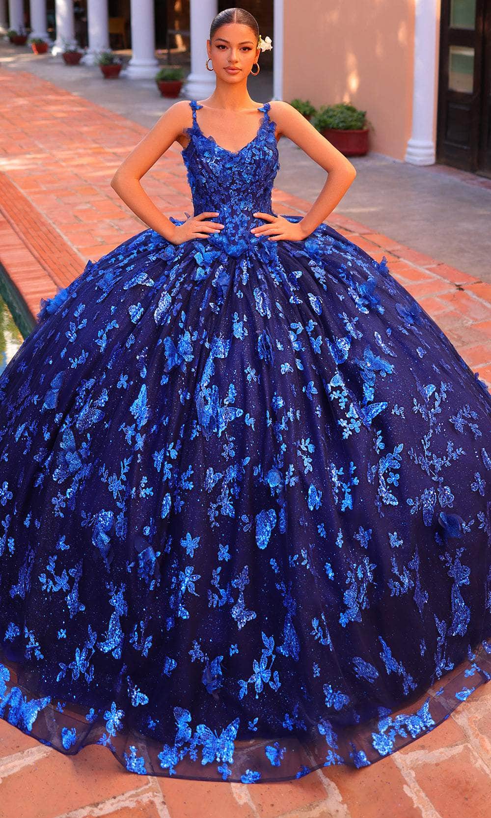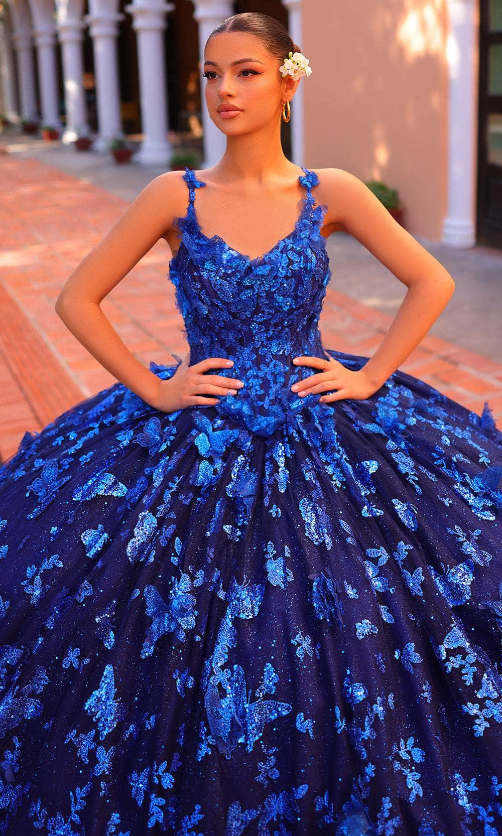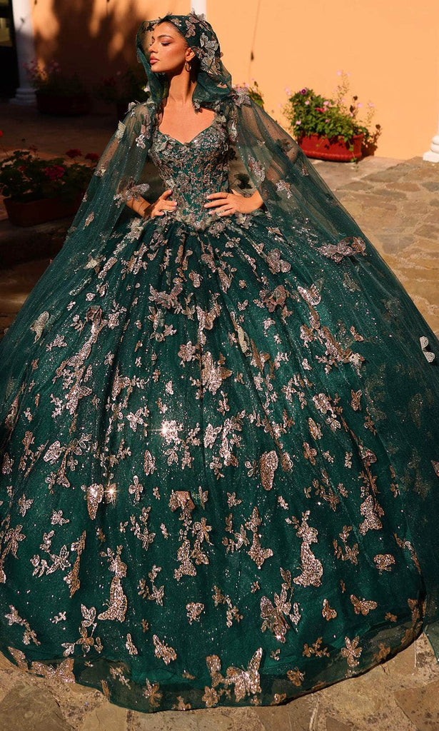 Experience enchantment with the Amarra 54260, a mesmerizing ball gown that radiates elegance and charm. Its embroidered lace bodice is a masterpiece, boasting a semi-sweetheart neckline that accentuates your grace. Delicate three-dimensional butterfly detailing adds a whimsical touch, evoking a sense of poise and wonder. Transitioning seamlessly into a glitter tulle skirt, each step becomes a dreamlike spectacle. Complete with a matching cape, this Amarra 54260 exudes regal sophistication, ensuring you leave a lasting impression at your quinceañera celebration. Models are wearing Emerald/Gold, Royal Blue, and Wine/Gold colors.