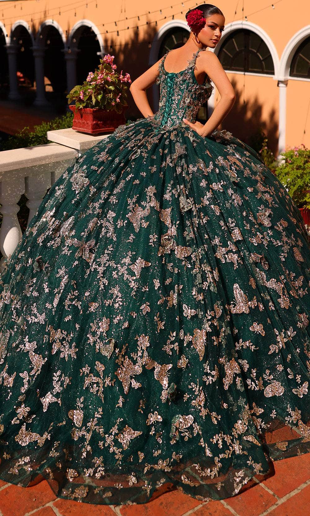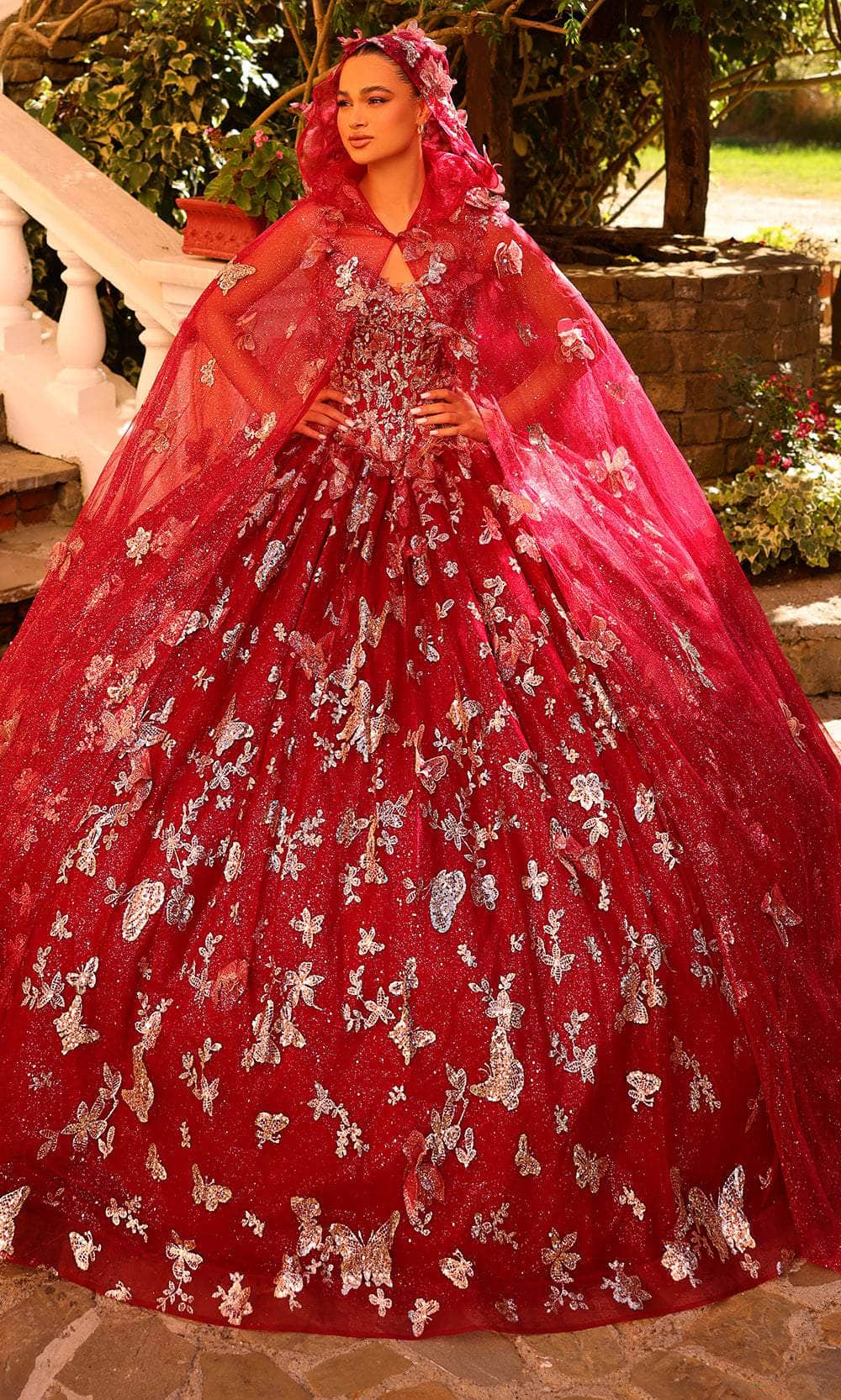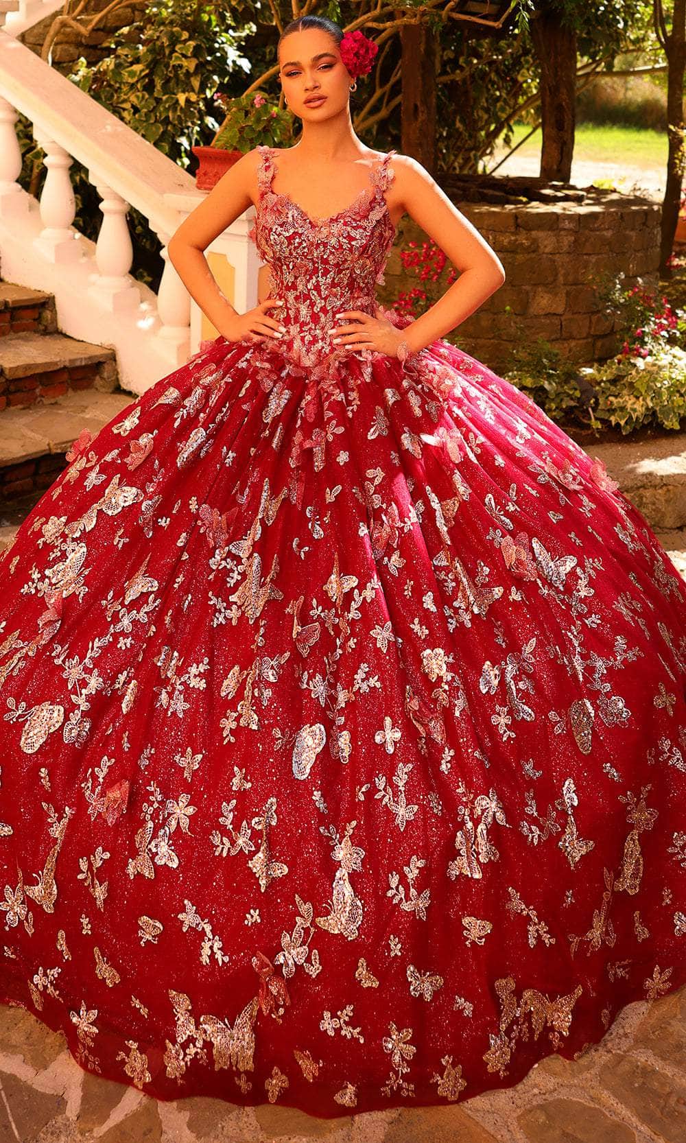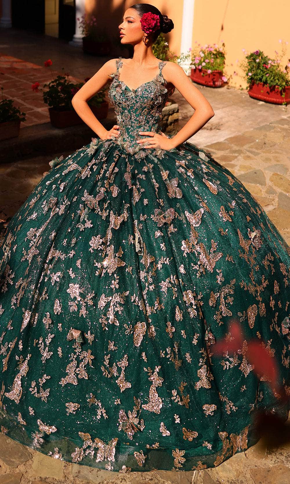 Experience enchantment with the Amarra 54260, a mesmerizing ball gown that radiates elegance and charm. Its embroidered lace bodice is a masterpiece, boasting a semi-sweetheart neckline that accentuates your grace. Delicate three-dimensional butterfly detailing adds a whimsical touch, evoking a sense of poise and wonder. Transitioning seamlessly into a glitter tulle skirt, each step becomes a dreamlike spectacle. Complete with a matching cape, this Amarra 54260 exudes regal sophistication, ensuring you leave a lasting impression at your quinceañera celebration. Models are wearing Emerald/Gold, Royal Blue, and Wine/Gold colors.