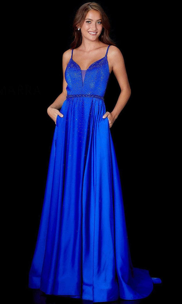 Flourish a stunning magnificence befitting a goddess in this Amarra 87234 creation. Adorned with glimmering rhinestones on this sleek satin silhouette, this dress parades a deep v-neckline with a sheer mesh inset. Delicate straps trail into an ornate bodice and a deep v-open back. Nipped with a beaded waistband, the flowy skirt parts with a high slit as it cascades to the floor with a sweeping finish. Dare to show off your stellar style in this Amarra masterpiece. Model is wearing the Royal Blue color.