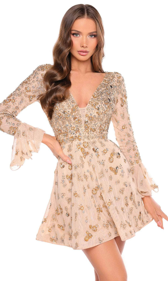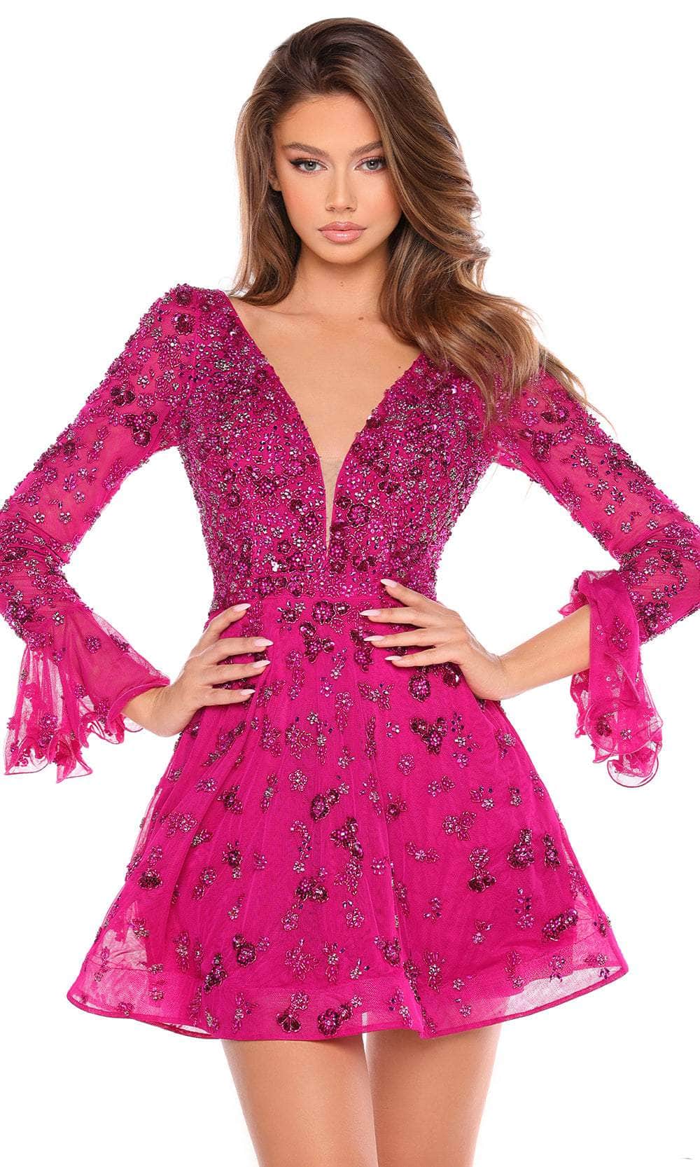 | Details: | Fitted, Long Sleeves, Mid-Thigh, Bead Embellished, Ruffles, Sheer Inset, Open V Back, Back Zipper |