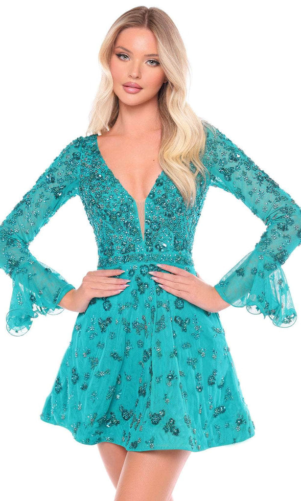 Get the party started in this spectacular Amarra 88032 cocktail dress. This dress showcases an alluring plunging V-neckline on a fitted bodice, complemented by long sleeves with ruffle details on its end. The back is truly enticing with its open V style, secured by a zipper for refined finish. Additionally, this whole attire is designed with bead embellishments, allowing you to sparkle with luxury all night long. It also reveals an A-Line silhouette which is evident down to the mid-thigh. Capture pure elegance in this classy and mesmerizing Amarra 88032 creation. Models are wearing Bright Fuchsia, Gold/Silver, Jade, and Peacock colors.