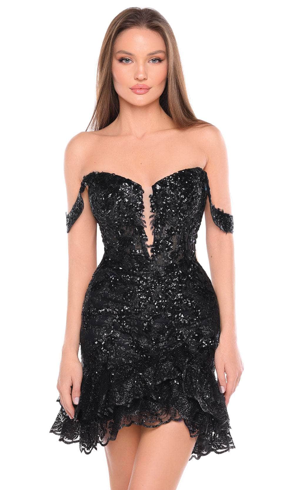 Embrace your inner fashionista in this cocktail dress from Amarra 88060. This ensemble is an extravagant stunner with its shimmering sequins and lace embroidery adornment throughout its length. The illusion corset bodice visible boning provides a structured fit, while the sweetheart neckline and draped off-shoulder sleeves define your collarbones beautifully. The sheath skirt hits the sexy mid-thigh, culminating in ruffles on the hem for added modern twist and drama. All eyes are on you in this Amarra 88060 masterpiece. Models are wearing Black, and Light Blue colors.