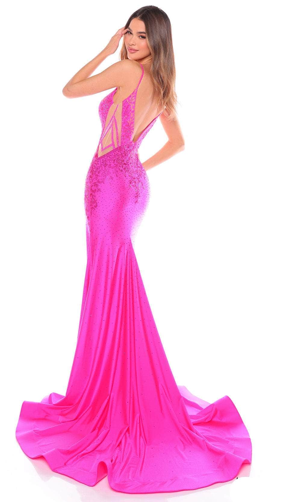 Details: Fitted Bodice, Hot stone Beadwork, Side Mesh Panels, Sleeveless, Sheer Insert, Open V-Shaped Open Back, Back Zipper Closure, Slit, Train