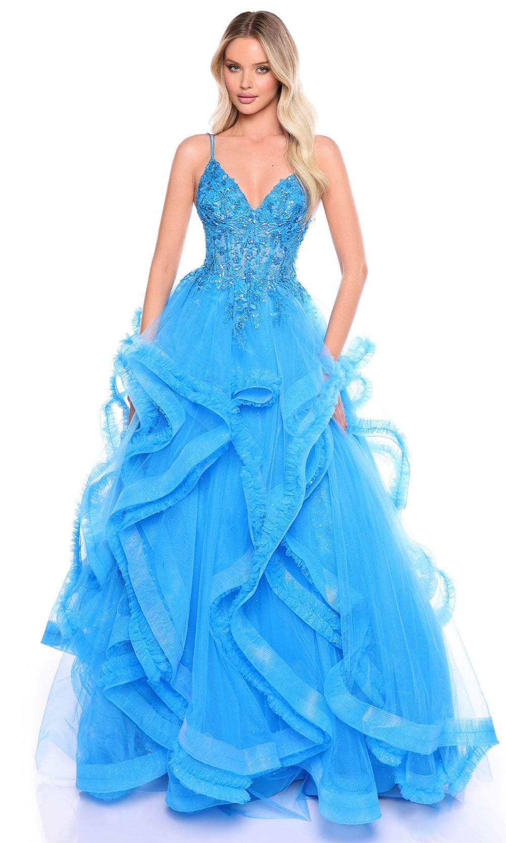 Ooze elegance and appeal with this Amarra 88094 gown, a striking masterpiece designed to captivate with its charming V-neckline adorned with intricate beadwork. The fitted bodice accentuates the waist, seamlessly flowing into a voluminous skirt crafted from layers of ethereal tulle fabric. The skirt, arranged in a gradient effect, creates a mesmerizing ball gown silhouette with cascading ruffles and undulating layers, exuding elegance and movement. Perfect for formal events or red-carpet occasions, this dress commands attention with its stunning contrast between the snug, embellished bodice and the grandeur of the billowing tulle skirt. This Amarra 88094 promises to leave an unforgettable impression, radiating sophistication and glamour. Models are wearing Periwinkle, Fuchsia, and Turquoise colors.